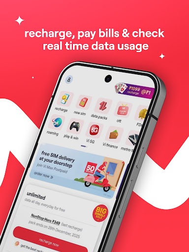 充值、网络套餐、设置来电铃声、获取 E SIM 卡并探索电影和游戏<br><br>使用 Vi 充值应用,轻松保持连接,它是您的一站式解决方案,可满足您的手机充值、网络套餐充值、账单支付、流量充值、来电铃声、国际漫游等诸多需求。无论您是预付费用户还是后付费用户,Vi 充值应用都能让您轻松管理所有服务。您可以享受 OTT 电影和游戏、周末流量结转、流量优惠和 eSIM 激活等专属优惠——一站式服务。<br><br>在 Vi 应用上庆祝 Vi 排灯节大促销!✨ ✨<br>享受预付费、后付费和 Vi 商店用户的专属节日优惠——充值、购物,在这个季节省钱!<br><br>📱 即时手机充值应用<br>🔹 为所有 Vi 预付费用户提供快速便捷的手机充值服务<br>🔹 现在,您还可以通过 Vi 应用为任何运营商充值<br>🔹 无限通话套餐、网络套餐和流量充值,让您畅享不间断浏览<br>🔹 特惠 4G 无限流量套餐,畅享高速互联网<br>🔹 流量畅享功能,方便您紧急充值<br>🔹 便捷的手机充值应用,支持 UPI、信用卡/借记卡、钱包和网上银行<br>🔹 排灯节预付费特惠:<br>🔹 充值 ₹101 立减 ₹10,充值 ₹1599 立减 ₹75<br>🔹 充值 ₹3799 立减 ₹100,即可获得额外 50GB 流量<br>🔹Vi MTV 折扣 - 充值 ₹175 立减 ₹30,充值 ₹248 立减 ₹75<br><br>📞 管理 Vi后付费套餐、账单及账单支付<br>🔸 在应用内安全支付您的 Vi 后付费账单<br>🔸 获取 Vi Max 后付费套餐,享受无限流量、OTT 优惠和生活方式特权<br>🔸 排灯节后付费专属优惠:<br>🔸 升级 871 套餐立减 50 卢比,3 个月使用<br>🔸 REDX 1201 和 REDX Family 1601 套餐立减 100 卢比,3 个月使用<br>🔸 OTT 套餐 (₹499) 立减 80%<br>🔸 Vi MTV 套餐 (₹248) 立减 80%<br><br>🎶 Vi 来电铃声 - 个性化您的通话体验<br>🔹 立即设置您喜爱的 Vi 来电铃声或问候铃声<br>🔹 宝莱坞、地方音乐、宗教歌曲和流行歌曲任您选择<br>🔹 为不同的联系人设置独特的 Vi 来电铃声<br>🔹 使用 Vi 姓名个性化通话用美妙的音乐迎接来电<br><br>📡 Vi SIM、eSIM 和 MNP 服务<br>🔸 在线购买新的 Vi SIM 卡,即可享受免费送货上门服务<br>🔸 简单几步即可将您的 SIM 卡移植到 Vi,并享受特别优惠<br>🔸 为兼容设备(例如 iPhone 和部分 Android 手机)激活 eSIM<br>🔸 查看 MNP 状态或跟踪您的 SIM 卡移植请求<br>🔸 通过应用程序轻松将实体 SIM 卡升级到 eSIM<br>🔸 激活旅行 eSIM 卡,方便国际旅行<br><br>📊 查看数据余额和使用情况<br>🔹 轻松查看 Vi 数据余额并跟踪使用情况<br>🔹 获得数据续期优惠和额外数据优惠<br>🔹 使用 5G 数据、Vi 网络套餐和数据优惠保持连接<br><br>🌍 Vi 国际漫游<br>🔸 选择最佳的 Vi 国际漫游套餐,实现无缝全球连接<br><br>💡 公用事业缴费 - 在线支付账单前往<br>🔹 电费缴费 - 直接通过 Vi 应用向各大电力供应商付款<br>🔹 水费缴费 - 轻松结算水费<br>🔹 液化石油气 (LPG) 预订 - 预订并支付气瓶补充费用,尊享独家优惠<br><br>🛒 Vi 商店 - 独家优惠和折扣<br>🔸 购买 VIP 电话号码、专属手机号码和自选号码<br>🔸 购物、餐饮、旅行和 OTT 订阅均可享受折扣<br>🔸 订购新的 Vi SIM 卡,即可享受送货上门服务<br>🔸 在 Vi 商店享受精彩优惠,欢庆排灯节<br>🔸 电子产品最高 70% 折扣 - 智能手表、耳机、音箱、耳麦等<br>🔸 礼品最高 20% 折扣 - 节日期间馈赠亲朋好友的完美礼物<br><br>📺 Vi 影视娱乐<br>🔹 畅享 Vi 影视,包括直播电视频道、电影和 OTT内容<br>🔹 在 Vi 游戏上玩游戏赢取奖励<br><br>💬 Vi 客服和全天候支持<br>🔸 通过 WhatsApp、聊天或电话联系 Vi 客服,获取即时支持<br>🔸 使用您的 AI 聊天机器人 Vic 获取快速帮助<br>🔸 在应用中查看 Vi SIM 卡激活情况、Vi 数据包和余额详情<br><br>立即下载 Vi 应用,享受无缝连接、轻松充值、娱乐和独家优惠——一站式服务!