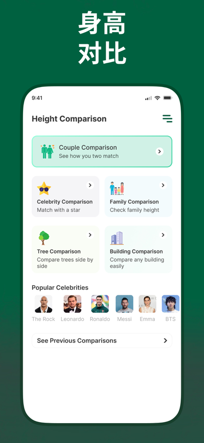 身高对比:厘米和英尺 – 轻松测量和比较身高 你想比较朋友、家人甚至名人的身高吗?或者你想知道 1–4 个人之间的身高差异?这款身高对比:厘米和英尺应用专为有趣、互动且精准的身高测量和比较而设计。应用会以厘米、英尺和可视化图表显示结果,让你清楚了解身高差异。 通过身高对比:厘米和英尺应用,你可以轻松并排比较朋友、家人或名人的身高。无论是男对男、女对女,还是男女之间的比较,应用都能提供精准的可视化结果。你还可以同时比较情侣或多个家庭成员,非常适合社交或个人使用。只需选择单位(厘米或英尺),输入身高,即可立即生成带有可视化呈现的身高对比图表。 主要功能: 1. **人物身高对比** 一次可比较 1–4 个人,支持男性和女性。轻松比较朋友、家人或名人的身高。可视化图表帮助你快速理解身高差异。 2. **名人身高对比** 好奇你的身高和明星的差距吗?我们的应用可以让你与名人的身高进行比较,增加趣味和互动体验。 3. **可视化身高图表与图片** 交互式图表和图片让对比更加直观和有趣。可以调整和对齐图片,实现完美的并排视图。还可以自定义颜色,满足你的偏好。 4. **多种单位** 支持厘米、英尺和米的切换,方便又准确。 5. **有趣又互动** 非常适合聚会、学校、运动或日常好奇心。与朋友、家人或名人比较身高,立即看到差异。 立即下载这款用户友好的身高对比:厘米和英尺应用,测量、比较并可视化人物和名人的身高(厘米或英尺)。看看谁更高,创建身高对比图表,享受互动而精准的身高测量体验。 如果您需要任何帮助,请访问 https://calculator-online.net/contact-us/ 联系我们。 免责声明: 本应用仅供娱乐和参考之用。所示高度为近似值,可能不准确。 隐私政策 https://calculator-online.net/privacy-policy/ 服务条款 https://calculator-online.net/terms-of-service/