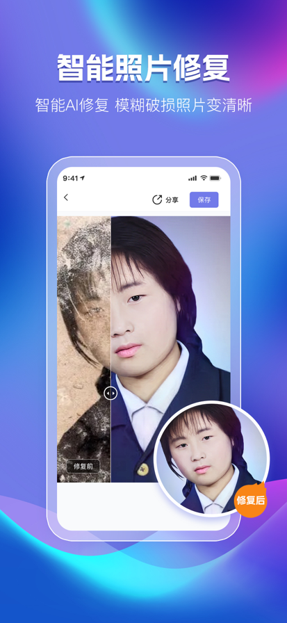 立即修-AI照片修复软件 是使用全国领先的AI图片修复技术打造的在线照片修复的软件。 为用户提供老照片修复丨照片修复丨照片上色丨照片放大丨面部修复丨噪点消除丨去模糊丨去划痕丨超分辨率丨照片扫描等服务 只需要从手机选取你要修复的照片提交处理,就可以轻松的得到修复好的照片了。 【AI照片修复】 基于先进的AI技术,针对各种类型的旧损照片,通过计算机技术进行修复,包括扫描褪色、残损照片或胶片,调整暗调/高光以改善面效果,修正曝光斑痕,利用曲线调整图层进行局部遮光和局部额外曝光,扫描并修护曝光过度的照片,最终达到较完整的图片。 【黑白照片上色】 基于先进的AI技术,通过大量照片上色案例做基础,精确还原符合场景的色彩,给您的照片添上记忆的颜色! 【照片无损放大】 基于先进的AI技术,对分辨率低的照片进行自动补充细节,让您的照片轻松变成超分辨率的高清大图。 【照片去模糊】 基于先进的AI技术,对模糊照片实现智能快速去噪,优化图像纹理细节,还您一张自然且清晰的照片。 【照片降噪】 基于先进的AI技术,智能去除由成像设备或者外部环境导致的照片噪点,使得图像更加干净,细节更加突出。 *未来还会有更多黑科技功能 如果您在使用过程中遇到任何问题或建议,欢迎随时联系我们: 官方客服电话:400-888-0960 反馈建议邮箱:bd@zhipianbang.com 隐私政策:https://lijixiu.zhipianbang.com/mobile/agreement/privacy 用户协议:https://lijixiu.zhipianbang.com/mobile/agreement