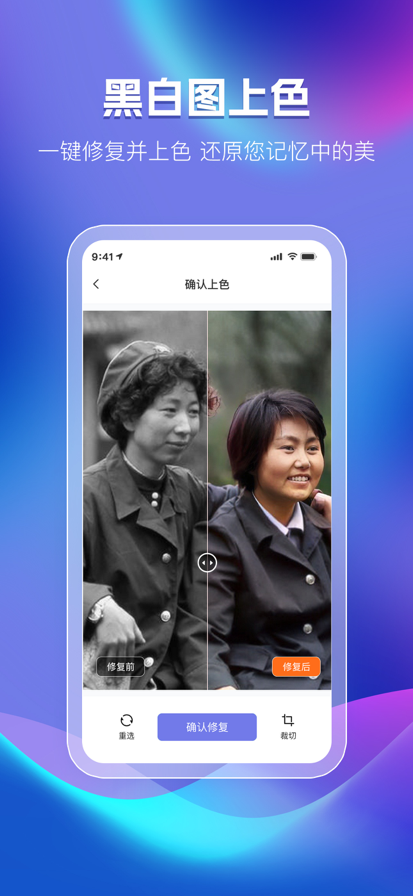 ※※ 全网领先的专业老照片修复APP正式登陆App Store啦!※※ 看看来自用户的真实反馈: 【温**猫】-“姥姥年轻时候拍的照片,修复的太好了,强烈推荐~” 【英**情】-“黑白照片上色太厉害了!!不知道怎么做的,感觉一下子穿越了几十年!” 【Cr**sh】-“之前用胶卷相机拍的几张老照片,修复的还不错,比较清晰。二十几年前的青春回忆啊~” 《专业老照片修复》借助于神经网络和人工智能引擎,让你近距离感受科技的力量~ 【修复老旧照片】 模糊照片、斑驳照片、失焦照片、低清照片一键修复,焕然如新。 【黑白照片上色】 通过超百万张的黑白照片模拟上色,目前人工智能的上色技术已经足以令人惊叹! 精确还原当年的场景色彩和人物神韵,仿若穿越时光,恍如隔世 如您有任何疑问,都可以咨询我们的在线客服哦~ 客服微信:photoai