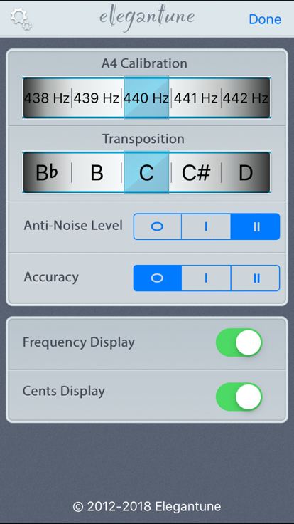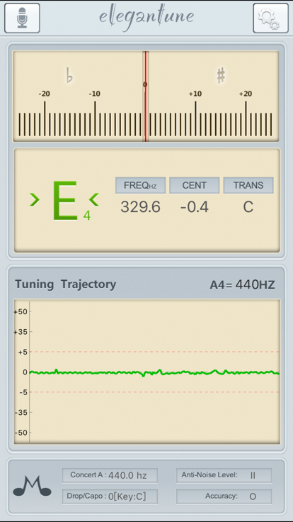 真的很棒!鼎力推荐!我是学音乐的 下过几款调音软件 还是这款好。简单明了。推荐!必须5星好评!-- StevenYangMJ 钢琴88键全部识别 牛死了! -- 222222222222232 最好最棒。可能是目前最好的校音器!非常好用。 -- 寻求好的软件 很棒! 很好用! -- 掌劍雙絕 目前使用过的最好的调音器了,对比同事花1998购买的TuneLab,这个算是超值了!大大的赞!!!-- 鸣书涵 关注我们的微博:@elegantune --------------------------------------------- 雅调是一款专业的十二平均律调音器(校音器)app,它可以快速、精确的校准您的各种乐器,比如吉他、贝斯、尤克里里琴(Ukulele)、小提琴(Violin)、钢琴(Piano)等,以及各种管乐器和民乐器(古筝,古琴,二胡,琵琶)。 雅调具有如下特色功能: 1、音分偏移指示:通过指针指示当前音离准音的音分偏移量,简单直观,方便用户查看校准状态; 2、音名展示:包含音名、音名偏移方向指示、音分偏移量,以及移调模式。 2、音分波动曲线: 结合信号变化,能够在一定范围内观察设备状态,并非常直观的看到琴弦发出声音信号的稳定度 ; 3、三种抗噪级别:最低抗噪能够进行0.1s时长的短音检测。最高抗噪能够在杂音为4倍基音震幅下检测出准确的标准基音。默认设置是:II,为最高抗噪级别; 4、三种精度设置:0.1音分、1音分、3音分,默认设置是:O,为最高精度状态; 5、三种信号输入模式:麦克风、拾音器、蓝牙。 关于雅调的音分曲线的详细说明: 1、音分曲线是对乐器声音过程的记录播放。如果曲线颜色全部都为绿色,那您的设备将是处于一个准确状态。+-5cents 、音分曲线属于高精度调试,作为雅调最高水平的体现。就像Peterson拥有strobo的高灵敏度显示模式但是同样拥有着最高精确度的校音算法。两者需要相辅相成。 2、音分曲线的实现需要对过程音进行最高级别的声音频率判定反馈出无差别的真实音波动图。 3、音分曲线需要全音域进行分析,而不能指定音分析,针对于绝大部分的主流乐器都进行了采样录制分析。 4、音分曲线需要对每一个信号的输出都做出有效判定,需要对音名识别做到最高程度的辨识。最高级别的谐波辨别技术。 音分曲线将为您带来如下帮助: 1、您购买新设备的时候观察声音的稳定度。作为乐器是否值得购买的一个重要依据。 2、您设备是否已经老化,或者沾污,或者弦已经需要更换。 3、三级抗噪级别,如果是非常短的高音,调整到最低抗噪级别,您可以结合信号曲线观察到目前非常难检测到的声音频率,支持对钢琴88音的检测。 4、非常强的低音拾取技术,在曲线里面能让您更直观的看到您所需要的数据。对于管乐等难度大的设备都能够非常好的进行调整。 非常感谢大家对我们产品的认可及反馈,让我们产品在校音方面更趋于完善,我们会继续努力做世界上最完美的调音器。