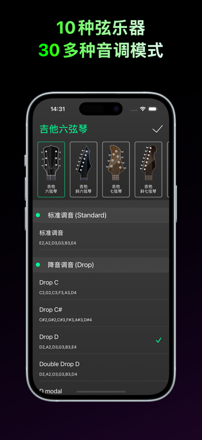 吉他调音大师是一款免费的专业级调音器,一款高级调音应用。它不仅适合一系列弦乐器的调音,还能助您学习新的和弦,唤醒往日的和弦记忆。对于任何水平的吉他乐手来说,它都是最简单、最快捷、最精确的调音应用! 适用于尤克里里、吉他、小提琴、古筝、二胡、钢琴、琵琶、大提琴、古琴、拇指琴等和弦乐器调音。 功能: -精准快速调音:实时识别音高,准确给出识别结果,对接国际音高标准,调音误差低。 -自动调音:只需拨响琴键或琴弦,APP自动显示当前音高,快速进行调音操作。 -手动调音:手动选择需要调音的琴键或琴弦,有针对性的调节音高。 -吉他模拟器: 尼龙吉他,钢吉他,爵士吉他,清洁吉他. 真实模拟弹奏体验 - 独奏模式:选择不同的吉他类型,自由发挥你喜欢的音符 - 和弦模式:不同的和弦组合,伟大的方式来练习弹奏,迅速成为吉他专家 -和弦辞典练习 提供多种和弦演奏示范及智能陪练功能,让和弦切换变得轻松高效。 UNLIMITED ACCESS SUBSCRIPTION - No ads - Play guitar use any chord - Support any types of guitars - Unlock 1000+ guitar chord - Reverse guitar chord finder - practice tools anytime - The subscriptions are $2.99 monthly with free trial - Payment will be charged to iTunes Account at confirmation of purchase - Subscription automatically renews unless auto-renew is turned off at least 24-hours before the end of the current period - Account will be charged for renewal within 24-hours prior to the end of the current period, and identify the cost of the renewal - Subscriptions may be managed by the user and auto-renewal may be turned off by going to the user's Account Settings after purchase - Any unused portion of a free trial period, if offered, will be forfeited when the user purchases a subscription to that service, where applicable - Terms of use: https://simplenotations.oss-cn-beijing.aliyuncs.com/guitar_item.html - Privacy of use: https://simplenotations.oss-cn-beijing.aliyuncs.com/guitar_privacy.html