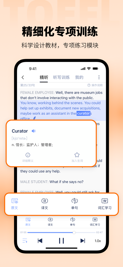 托福官方合作伙伴ETS正版授权备考资料,精细化专项训练助力托福备考,全方位留学规划以及院校咨询,实现留学梦想,就从选择小站托福APP开始!「小站托福」APP 是一款针对托福考试的备考产品作为一款备受赞誉的专业托福备考工具,我们对托福考试全新预测、微课堂等功能,帮你掌握科学的备考方法,帮助您更有效率参加备考。 ETS正版授权官方备考资料库 小站托福与ETS官方合作,拥有正版授权的TOEFL历年真题资源(包括但不限于Official 1-71套历年备考真题,个别缺失除外),托福口语、听力、写作、阅读、单词贴近真实考试的全科模拟练习,让您的每一次刷题都犹如实战演练。 精细化专项训练 小站推出的针对托福备考的全新预测是冲刺期的备考指南,托福听力部分采用科学方法设计,提供全文播放、变速听写、划词翻译及精听训练,并独家收录科学美国人等权威听力素材,提升您的听力理解能力。口语、阅读和写作同样设有专项练习模块,依据官方题型精准分类,让您在每个科目上都能得到深度且针对性的训练。 智能模考与机经预测 配备完整的全真模拟考试环境,高度还原托福在线考试体验。同时,基于大数据分析与专家团队研究,定期发布托福考试趋势及重点复习指南,助您轻松应对每一次考试变化。 微课堂与小站专业教师指导 内置丰富多样的微课堂内容,由行业资深教师亲自讲解,针对托福各科考点和难点进行深入剖析,让您在碎片化时间里也能有效吸收备考技巧。 海量备考资料与精选解析 收录众多核心备考材料,如黄金口语80题、官方真题长难句解析、托福口语阅读写作等全方位考试技巧,为考生量身打造个性化学习路径。每一道题目均配以专业详尽的解析,帮助您掌握解题思路。 留学规划与院校资讯 小站托福APP还贴心地增设了留学版块,囊括海外高校信息、申请信息以及AI智能选校服务,一站式满足您的留学需求,提前规划未来方向。 小站托福APP,我们用心做一款好的产品帮助您使用科学的方法和个性化的服务,在这里找到适合自己的备考策略。让我们的专业陪伴您走过托福备考的每一步,共同开启通向世界顶级学府的成功之门!