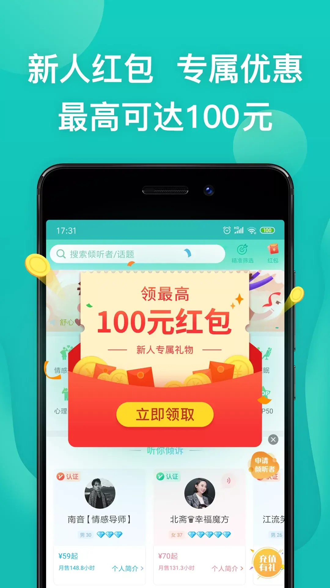 【温馨提示】 想入驻平台成为老师?请下载倾听者专用App ——「松果倾诉倾听者」申请入驻。 服务全球超过86个国家的1对1咨询平台,用户信赖的移动互助应用。松果倾诉提供情感、恋爱、婚姻、家庭、心理、校园、职场、生活、亲子等问题咨询服务,超过10万精英倾听者:情感咨询师、婚姻家庭咨询师、心理咨询师、职业规划师、催眠师、律师、海归、创业者、优秀在校生、辣妈、教育达人、同性友人、超百种行业人士等各种背景过来人,总有一个能帮你! 【隐私安全】1对1匿名倾诉,无须注册,文字通话不留痕迹,还支持通话变声哦。 【实时高效】7*24小时真人在线,随时随地,想说就说,想问就问。 【实力认证】超过10万精英倾听者,放心说心事! 【交流方式多样】文字、图片、语音、实时通话,“全方位”的专业服务,面对面的感觉,让您身临其境。 【温馨社区】除1对1倾诉外,还有求助广场、心情分享、公开课、群组、各种福利活动。 找朋友倾诉,不如找松果倾诉! 【打开APP领红包】 ------------------------------------ 【* 特别说明】 想入驻松果倾诉平台做兼职或者全职的咨询师,请到商店搜索《松果倾诉倾听者》APP,下载后申请入驻,现在申请更有免费学习资料、新人扶持流量领取。 使用过程中有任何问题,请联系我们: 客服电话:400-633-6659 邮箱: app@51songguo.com