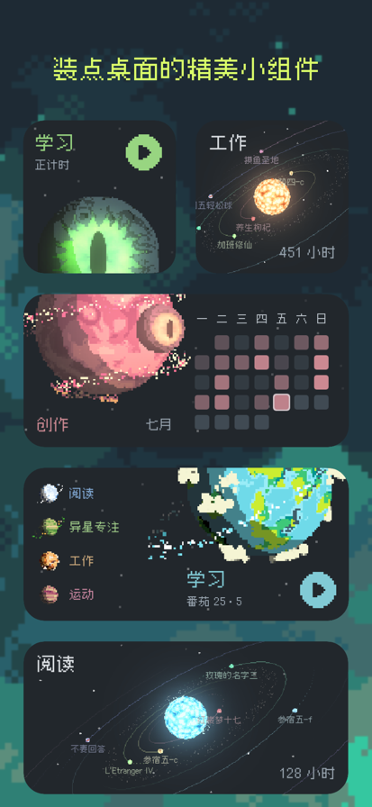 异星专注是一款像素风游戏化专注计时软件。在这里,你的专注不再是枯燥的、重复的、无意义的,因为你的每次专注,都将改变专属于你的星球。 你是否有这样的困扰:每次下定决心做些长期来看非常有价值的事,比如背单词、练习乐器、健身锻炼,或是掌握一门新的语言。起初,你充满动力,但用不了多久,热情开始消退。背单词让你痛苦,乐器被束之高阁,健身变成负担,新语言的进度停滞不前…… 你开始质疑自己:哎,我早应该看清自己没有学霸体质,做不到需要长期投入的事。 这当然不是真的!让我们来告诉你真正的原因。 【即时激励匮乏】你很清楚这些任务的长期价值,但是当下这半小时的专注到底有多大的意义? 【重复导致枯燥】当一开始的新鲜劲过去后,你意识到了任务的重复性,可能会让人感到乏味和疲惫。 【过度负面关注】纠结于没做成的事,而不是肯定自己做了的事,可能会造成更负面的自我评价,从而丧失持续的动力。 让异星专注来帮助你吧! ====== 异星专注的解决方案 ====== 异星专注是一款游戏化的专注计时软件,通过星球的演化具象化专注时间,赋予它宇宙级的意义感,让你实现长期的无痛专注。 【情感化设计和意义感】 每次专注后,你会看到在专注过程中这颗星球发生的故事。即使只专注了五分钟,对你的星球来说也是 3853 万年的演化,所以你的专注至关重要。 想加大放弃专注的筹码?你可以开启“硬核模式”,专注失败可能导致你的星球被炸毁哦! 【阶段性激励】 短期激励:每次专注后,星球的地貌都会改变,并向你讲述此间的星球故事; 中期激励:专注若干小时后,星球会产生更显著的地貌变化,例如形成岩浆、海洋、陆地等; 长期激励:专注十来个小时后,星球会完成演化,你可以将它收藏到星系系统中,每个项目对应一个星系,直观地展示了你在这个项目中的长期积累。 【持续的新鲜感】 我们提供了上百种不同的星球设计,并且每颗星球都是独一无二的,充分满足你的好奇心和收藏欲,带来源源不断的惊喜。你只有通过专注完成星球的演化后,才能看到它的庐山真面目。 通过专注获取的“星尘币”可以用来解锁新的星球种子,激励你不断保持专注。 ====== 异星专注的特别之处 ====== 【独具匠心的设计】 异星专注使用了独特的像素风设计,保持极简的同时,在很多细节上融入了惊喜的小彩蛋等待你去发现。我们相信异星专注的美感可以让人心生愉悦,这种情绪价值最终将转化为更多的专注时间。 【有趣的游戏元素】 异星专注对游戏化设计的拥抱既是大胆的,也是克制的,更是专业的。我们既希望游戏元素可以帮助你保持专注的乐趣,也很在乎你是否真的能专注。我们排除了一切可能让你分心的元素,因为我们真的在意和你一起专注实现长期目标。 【灵活的专注模式】 异星专注支持正计时、倒计时、番茄工作法,在番茄工作法中,你可以灵活指定专注和休息时长,以及专注几个周期后更长的休息时间。 【便捷的项目管理】 每个项目对应一颗星球,你可以用项目跟踪不同类别的专注时间,在首页通过左右滑动屏幕快速地切换项目。 【专属的统计图表】 根据你的专注数据,我们提供了个性化的统计图表,让你了解自己的专注情况,并且更有动力保持持续的专注。 ====== 异星专注的创造者 ====== 我们是一对程序员夫妻:钰猫和羡辙。 钰猫的人生理想是做游戏,羡辙的人生理想是写小说。所以,你会看到在异星专注中,融入了很多我们对游戏和文字的理解,也希望带你们进入这个感动我们的世界。 说到创造者,不得不提及在这里创造了自己专注宇宙的用户。你们的喜爱、投入、迫不及待和朋友分享的热情远远超出了我们一开始的预期。你们是异星专注的共建者! 我们正走在实现人生理想的道路上。通过专注,你也一定可以。 服务条款(Terms of Use):https://byland.work/exocus/terms.html 邮件联系我们:exocus at byland.work 小红书及抖音:@异星专注的老夫妻