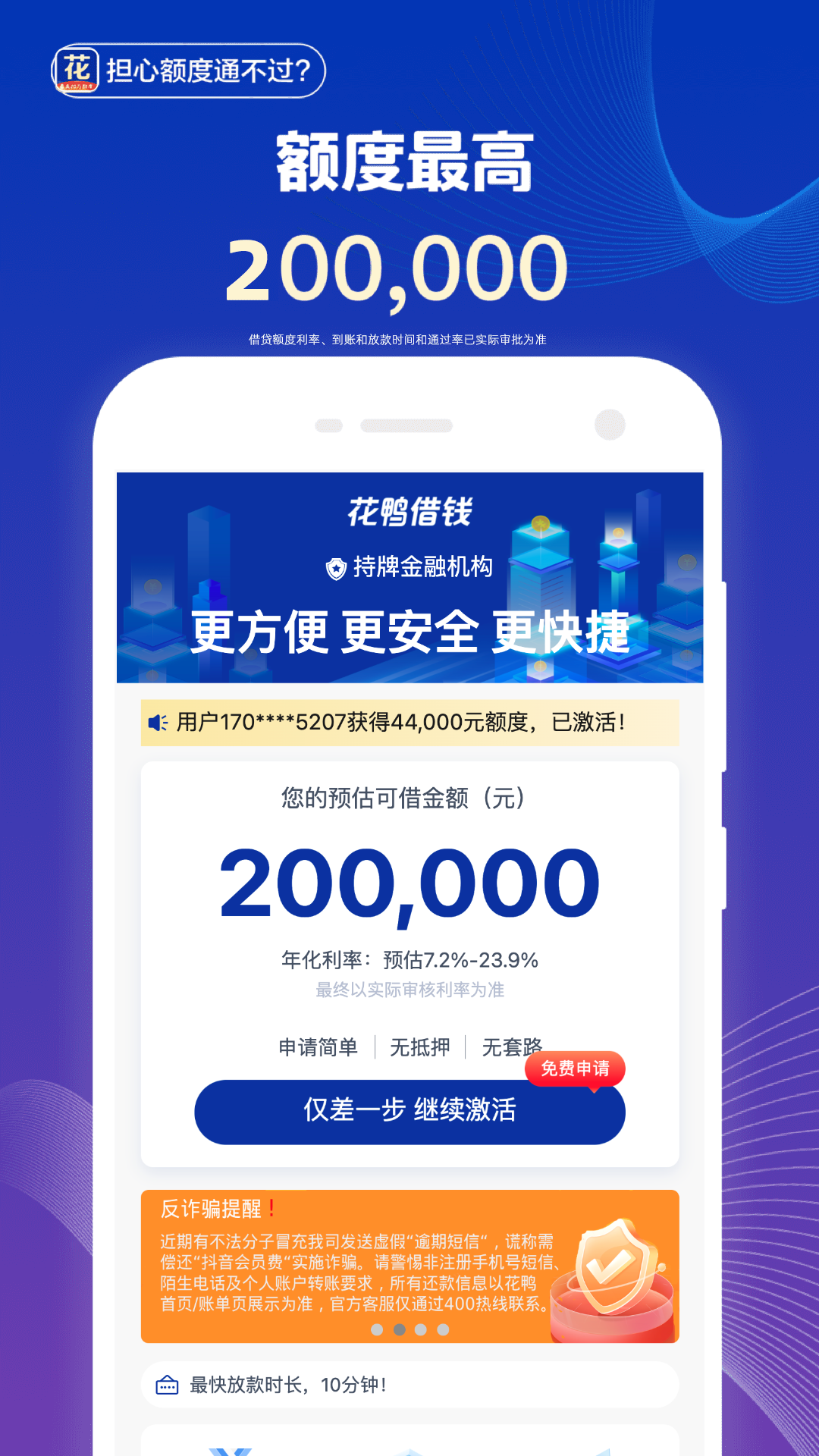 “花鸭借钱”是一款面向年轻人的消费信贷APP,提供合规、快捷、安心的借款服务。 恋爱、买东西、付房租、请吃饭、资金周转不用愁, 贷款借钱就找“花鸭借钱”,息费透明,申请便捷,还款灵活。 (仅限对22-55岁用户借款) 【产品优势】 1、息费低:持牌金融机构息费超低 2、高额度:额度高至20万元,期数灵活选择 3、审核快:简单操作,自动审批,快速放款 4、放款快:实时审批,快至10分钟到账 5、够安全:持牌金融机构产品,值得信赖 6、合规机构:持牌合规,坚决打击套路贷 【联系我们】 如果您有任何问题,欢迎联系我们 客服电话:400-000-3586 官网地址:www.huayajieqian.com 微信公众号:花鸭借钱 【温馨提示】 1、贷款有风险,借款需谨慎;请根据个人能力合理贷款,理性消费,避免逾期。 2、贷款额度、利率,放款时间以实际审核为准。