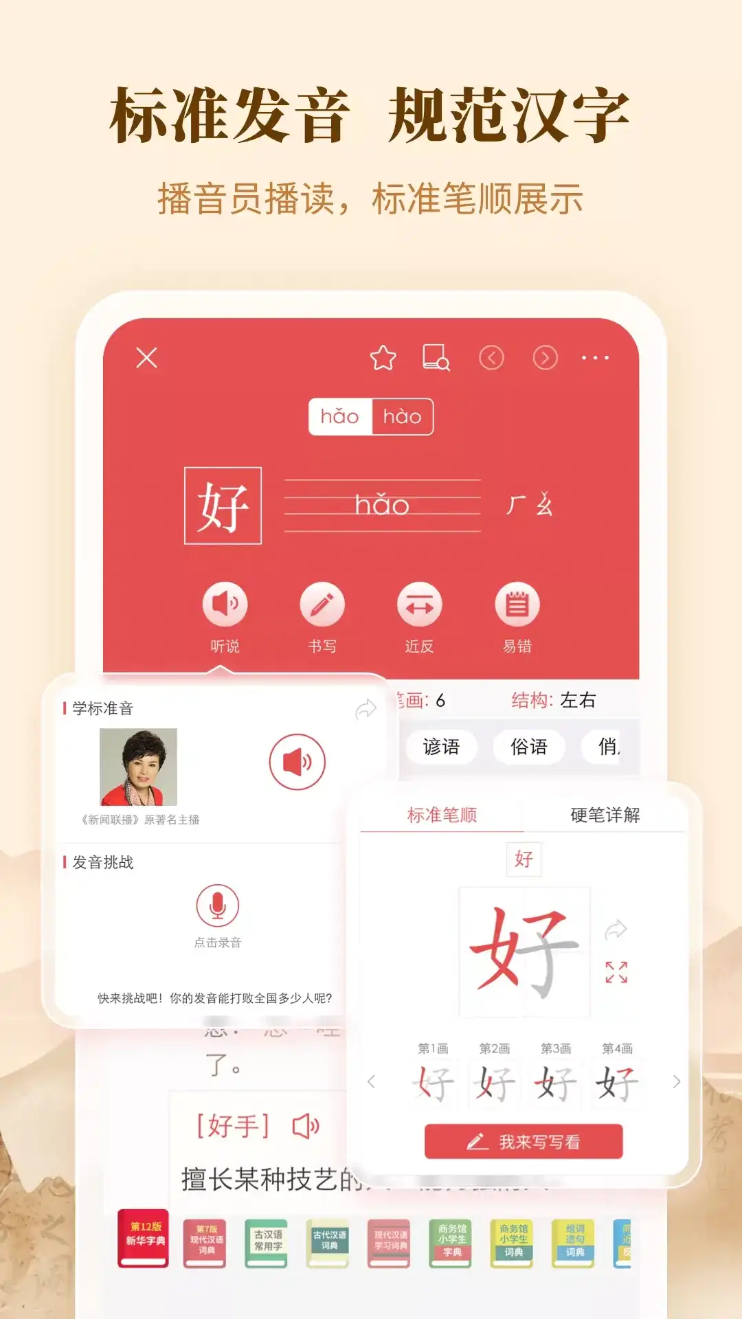 《新华字典》App,商务印书馆权威出品,中国社会科学院语言研究所编修。新增"工具书云平台"模式,收录27部权威字词典,为用户打造一站式学习助手。 ◆权威辞书知识◆ • 新中国首部现代汉语字典,汉语辞书典范之作 • 荣获第四届国家图书奖荣誉奖、第三届国家辞书奖特别奖、第三届出版政府奖图书奖提名奖 • 获“最受欢迎的字典”和“最畅销的书(定期修订)”两项吉尼斯世界纪录 • 入围数字出版精品遴选推荐计划,累计下载量超1亿次 ◆全能学习宝库◆ 【基础夯实】完整收录《新华字典》,同步纸质书更新 【拓展升级】融合《现代汉语词典》《古汉语字典》等共27部工具书 【发音规范】新闻主播标准读音,支持跟读对比练习 【书写指导】动态+静态笔顺演示,屏幕临摹更直观 【专项突破】多音字精讲+易错字汇编,扫清语文学习雷区 ◆趣味学习法宝◆ 【汉字探秘】从甲骨文到简体字,动态展示汉字千年演变 【诗词天地】精选小学初中必背古诗,配套赏析注解 【闯关游戏】字词接龙/成语挑战/古汉语挑战,边玩边学 【每日打卡】易错字提醒+组词接龙+成语解密,5分钟轻松积累 ◆智能查词利器◆ 【纸书联动】扫码即查纸质书生字,笔顺动画秒加载 【多模检索】支持语音输入、手写识别、拼音、部首等多种查词方式 【学习管理】云生字本自动同步,支持个性化分类收藏 【智能助手】实时解答语文知识,推荐近反义词辨析 日新无已,望如朝曙,自上线以来,《新华字典》App不断丰富内容,提供了数十项增值服务,荣获诸多奖项,全面提升了“国典”品牌价值。 《新华字典》App,随时伴你身旁的“良师益友”。