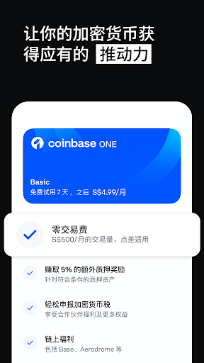 Coinbase 是世界上最受信赖的加密货币交易所,可以安全地买卖、交易、存储和质押加密币。我们是美国唯一公开交易的加密币交易所.<br><br>Coinbase 提供的精妙功能有这些: <br><br>有给加密币高手用的强大工具<br>- 用高级交易工具来买卖加密币并赚取质押奖励¹<br>- 使用由 TradingView 提供的深入技术分析、高级实时订单簿和图表。<br>- 研究和分析加密市场的高级工具,帮助您做出知青的交易决策。<br> <br>买卖和管理加密币<br>- Coinbase 是最受信赖的用于建立、管理和跟踪您加密货币投资组合的平台。<br>- 安全地无缝收发加密币。<br>- 质押加密币,并在像 Ethereum(以太币)和 Cardano 之类的加密币中赚取收益。<br>- 赚取如 USDC.² 之类的稳定币收益<br>- 轻松设置自动或重复性购买。<br>- 在全球范围内无缝转移加密币。<br><br> <br>安全且受监管的交易平台<br>- Coinbase 是唯一一家公开交易、总部设在美国的加密币交易所(NASDAQ 纳斯达克股票代码:COIN)。<br>- 所有客户资产均以 1:1 的比例持有,而且我们绝不会与客户进行反向操作或在未经顾客同意的情况下就用他们的资金举债投资。<br>- 我们的财务信息公开,并由四大会计师事务所之一每季度进行审计。<br>- 提供最先进的加密和安全性是我们平台的立足之道,而且我们的安全团队在不断努力确保您和您的资产免受新兴威胁的侵害。<br>- 从自动注册的双因素身份验证(附带安全密钥支持)、密码保护,到 Coinbase Vault 中的多重批准提款机制,我们为我们的所有用户提供强大的安全功能。<br> <br>COINBASE ONE<br>用 Coinbase One 来从加密币中获得更多收益。<br>- 零交易费、更高的质押奖励、优先获得支持服务等。³ <br>- 只有会员才能参与抽奖活动。<br> <br>Coinbase 钱包<br>- 更喜欢自己进行保管吗?请来看看 Coinbase Wallet。这是一款与交易所兼容、安全的加密钱包,让您能控制您的加密币、密钥和数据。<br>- 将加密资产安全地存储在您的加密货币钱包中。<br> <br>需要进一步的帮助吗?<br>请访问 help.coinbase.com 来了解更多信息以及联系 Coinbase 支持服务。<br> <br>隐私<br>请在 https://www.coinbase.com/legal/privacy 网页查看 Coinbase 的隐私政策<br>—<br>¹ 在某些特定地区可用。<br>² 购买 USDC 后,您就会被自动加入选择获得奖励。您可以随时选择退出。奖励的利率可能会发生变化。客户将能直接在其账户中看到最新的适用利率。<br>³ Coinbase One 服务会自动续订并需要定期付款。收益因地区而异。零交易费:不包括 Coinbase Advanced excluded;有利差。<br> <br>您是从加密币协议而非 Coinbase 那里获取奖励。Coinbase 的角色仅是连接您、验证者和协议的服务提供商。我们会将从质押中获得的所有奖励扣除信息透明的 Coinbase 费用后都转给用户。