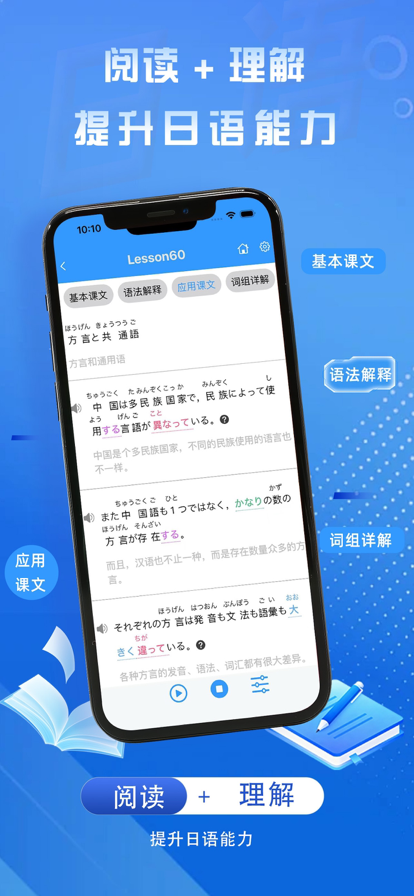 最完善的新版标日学习辅助APP。 在学习的过程中会不断cue到前面学习过的知识点,彻底打败遗忘曲线。 根据词性不同将单词标注为不同颜色。让你不知不觉中记住单词词性。 核心功能: • 课文学习:基本课文/应用课文切换,支持假名标注,配套音频播放 • 语法索引:按组浏览语法,支持搜索与折叠展开 • 单词学习:词性标注、释义展示、详情查看与收藏 • 句子学习:例句查看与语音播放 • 收藏系统:单词/语法收藏,集中复习更高效 • 小组件:展示收藏单词,支持快速切换(内购会员可用) 适合人群: • 有一定日语基础,N4/N5同等水平 • 新标日中级学习者 • JLPT N3 阶段复习用户 反馈邮箱: northpolecat@163.com polarcat1991@gmail.com B站: 北极猫1991