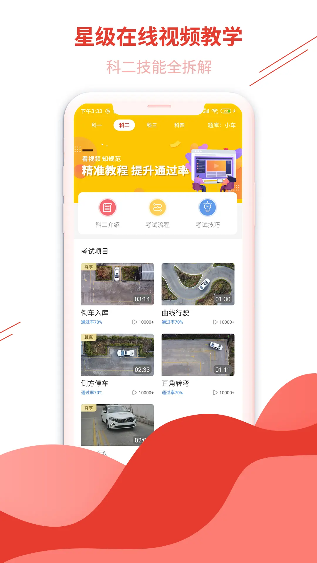 一款为广大驾考用户开发的驾照考试题库,支持小车、货车、客车、摩托车等各个考试科目的模拟考题。无论您是初次报名学车,还是已经准备好去考驾照,这款app都能帮助您顺利通过考试,快速领取驾照。 1、理论模拟考试、科目一、科目二、科目三、科目四,最全考驾照流程,一个app全都搞定。 2、科一/科四:逐题解析知识点,巧妙记忆交通标志、交警手势,更有科目一、科目四考试技巧与满分通过秘籍。 3、全真模拟:真实再现理论考试场景、科目三灯光官方考试录音,学习更有效,考驾照更轻松。 4、学车视频:为学员精心制作的科目二、科目三考试高清视频,先观看再操作,熟悉机动车运动轨迹,心里更有底,考试不心慌 【功能特点】 1.全方面:从考前准备到应考技巧,保姆式教学科三 2.遵标准:详细介绍各考察项操作要求及合格标准 3.多角度:视频文字多位一体,应试细节一目了然 4.真专业:专业教练指导操作,实地视频,全真模拟考试现场 5.新视频:紧跟新标准,及时更新,拿证快人一步