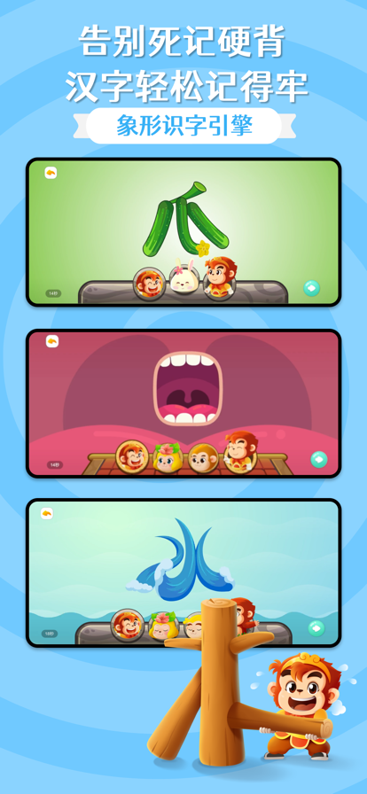 识字效果翻倍,家长省心不累 千万家庭口碑之选 15年专注识字启蒙 1000多次迭代更新 《悟空识字》是一款专注于汉字启蒙的产品,包含1500个常用汉字,5500+常用词句,75本原创绘本。 我们用经典名著西游故事,串联识字过程,提升孩子识字兴趣,强化汉字应用场景。通过“象形识字体系”,让孩子通过字形演变变化,直观理解汉字的来源,做到汉字“过目不忘”。配合科学课程体系下的多样汉字练习,实现汉字的听、说、读、写。三大体系协同运作,让孩子每天只需花费短短十几分钟的时间,一个月后能够开始自主阅读中文幼儿读物。 产品特色: 独创三大识字引擎 【象形识字引擎,帮助理解】 采用符合儿童认知思维的象形教学,每个汉字都配有象形变化动画,强调汉字特征,加强孩子对汉字的理解,建立长期记忆路径,让汉字学习不再是“死记硬背”,而是“理解后自然记忆”。 【科学进阶引擎,巩固记忆】 根据儿童记忆特点设计识字记忆巩固体系,每日学习一组汉字,体系化的学习模式,不仅有助于提高孩子专注力,还能帮助孩子培养良好学习习惯。识字体系为每个汉字设计“认、练、读、写、复习”多个环节,通过“形近字辨析”、“音形意练习”、“绘本阅读”、“错字复习”、“隔天复习”等等模块,让孩子不仅能认能写,还能应用。 我们还提供了75篇阶梯阅读内容,通过原创的西游小故事,引导孩子从“识字”过渡到“阅读”。 【西游情景识字引擎,激发兴趣】 以广受喜爱的经典名著西游记为故事背景,激发孩子学习兴趣,通过西游故事强化汉字应用场景,加深汉字记忆。孩子在识字的同时,也能感受传统文学的魅力。 软件同时还为家长提供了时间管理、学习报告、二孩模式等功能。我们希望孩子快乐识字,高效识字。 联系方式: 微信公众号:悟空识字 客服电话:400-666-3016(9:00-17:30)