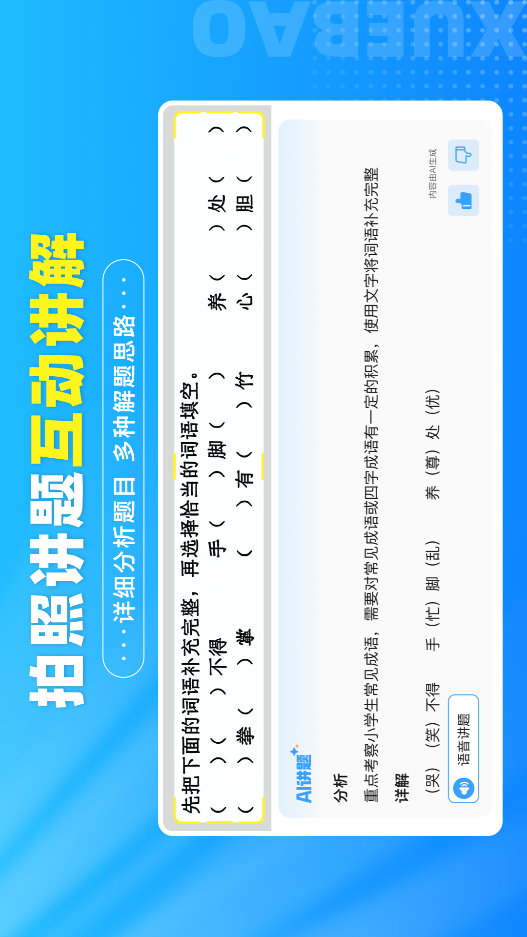 学宝是一款服务学生自主学习的同步学习APP,能够有效激发学习兴趣,帮助学生养成良好学习习惯。<br>学习内容以动画视频方式呈现,并与全国主要教材相配套。<br>学宝APP配备AI拍照讲题、作业批改、识字、听写、练字、口算、单词、听力、口语、错题本、刷题、课本点读、听课文、作文、字典等18多款智能教辅专项工具<br>学习打卡还能领学币,免费兑换多种实物礼品、卡通形象、皮肤装扮,激发孩子的学习兴趣和积极性,养成好的学习习惯。<br>全国4000万+家庭的信赖之选!<br>------------------<br>6大产品功能亮点:<br>【课内同步智能教辅】<br>覆盖人教版、北京版、苏教版、西师大版、青岛版、冀教版等95%以上教材,内容与教材章节同步,按照课本单元章节生成动画视频清单,针对语文数学英语不同学科的特点及内容,配套专项学习工具;<br>【9种学科专项工具】<br> 语文专项学习工具:识字、听写、练字、作文、字典;<br> 数学专项学习工具:口算;<br> 英语专项学习工具:单词、听力、口语;<br> 【4个综合辅导工具】<br> 错题本:分科目整理错题,专项练习错题智能记录存储;<br> 知识点:按科目知识点生成智能题库,海量练习题随时做;<br> 课本点读:与英语语文课本内容与校内课本章节内容同步,哪里不会点哪里,即点即读;支持单句重复,整册朗读,个性化复读,语速调节等功能;<br> 听课文:不需要看手机,就可以随时随地想听就听。磁带标准发音,对教材内容进行磨耳朵,通过听来让孩子熟悉和学习教材内容;<br> 【2个特色乐学工具】<br> 讲故事:听故事,学知识,随身听随时学,启蒙学习好工具;<br> 知识PK:在线学习PK答题,寓教于乐,提升学习兴趣,养成学习好习惯;<br>【有趣的学习形式】<br>内容以有趣的动画形式展现,让孩子轻松学习,爱学到根本停不下来;<br>【学习送学币】<br>完成学习任务就获得学币,多种学具玩具等实体礼品与卡通形象、背景、皮肤装扮免费兑换,帮助学生养成良好学习习惯,让孩子有目标,有动力,爱上学习!<br>--------------------<br>强力推荐:<br>【央视网】2020年度影响力在线教育品牌<br>【新浪教育】2020年度家长信赖在线教育品牌<br>【快手】2020年度快手教育生态教育普惠共建者<br>【人教出版社】《中小学数字化教学》第二届理事会理事单位<br>【今日头条】2019年度城市教育行业影响力机构<br>【腾讯新闻】2019年度影响力在线教育品牌<br>---