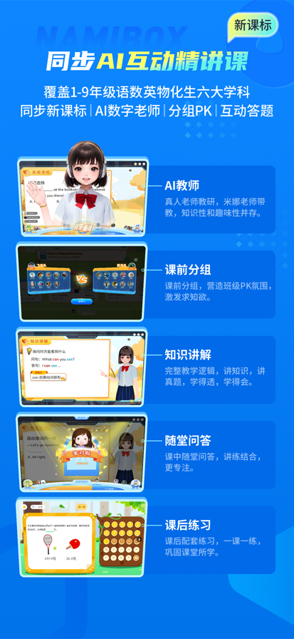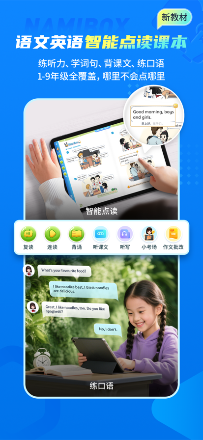 "纳米盒,AI 智能学习平台,中小学在线学习辅导 纳米盒,AI时代的学习神器!专研数字教科书与同步智能教辅12年,一款面向中小学生的课本同步闯关学的APP。覆盖语、数、英、物、化、生六大学科,1:1同步全国主流教材,科学设计每一课学习路径和学习内容,一站式搞定孩子预习、复习、练习、培优所有学习场景,帮助学生建立系统的知识体系,提升综合能力与自主学习能力。 【语文、英语点读课本】 覆盖新课标版本教材,标准发音,功能强大,孩子自主学习,哪里不会点哪里。 核心功能介绍: 语文、英语点读课本,各大出版社官方正版授权,覆盖人教版、沪教版、译林版、冀教版、北师大版、外研新标准、外研Join、陕旅版等50+教材版本,100%同步课本。 支持点读、复读、连读、翻译、跟读评测、智能背诵、听课文(正版音频)、课文生字、听写等十余种功能。新增 AI 智能辅导,覆盖小考场、练口语、作文批改、作文辅导、课文动画等多学习场景功能。通过沉浸式学习体验,帮助孩子纠正发音、扎实积累生字词,稳步提升英语表达的流利度与自信心,全方位夯实学科基础。 【语数英物化生同步闯关学】 【同步精讲课】每个单元5-10节满分精讲同步AI互动视频课,AI数字老师,分组PK互动答题,每节课5-10分钟,讲透一个重难点。 【同步精准练】根据每一课的知识重点,设置一课一练的课课练,让孩子快速刷题,扫清知识盲点;以及一周一测的同步单元测,一键打印,扫码看解析,做好单元总复习。 【语数英同步学教辅和预复习笔记】5000+语数英同步学教辅,可部分代替纸质教辅书,减少纸质教辅书购买量,提升自主学习力。同时覆盖预习、复习、巩固、培优等孩子课后在家学习场景,减少家长辅导课业负担,一站式解决学习问题,学习更系统、更专注。 内容介绍: 语文:课本预习(本节课的新知识梳理、难点攻克、拓展知识)、课本复习(用学霸的方法复习,包括课文详解、内容梳理、习题精讲)、课文生字(汉字笔顺、组词)、词语听写(解放家长,自主听写)、学作文,同步字帖、默写本。 英语:课本预习(本节课的单词、句式梳理、难点攻克、拓展知识)、课本复习(用学霸的方法复习,包括句型、语法的详解、在线练习巩固)、练听力(20+种题型难度递进)、练语法(9000+练习攻克重难点)练阅读,还有描红本、默写本。 数学:学课本知识、教材母题变式、攻克易错题、同步单元测。 【专项培优打卡学】 新增上线“学习计划”功能,以""学习闯关+成长升级""为主线,将抽象的学习目标转化为具象的打卡学习关卡,设置打卡奖励,驱动持续学习。自主创建学习计划,每天15分钟,专项训练全面提升。系统监督学习过程,解放家长更放心。 内容介绍: 包含不限于校内同步学习计划、期中期末备考计划、专项提升计划(国际音标、自然拼读、英语语法、语文阅读、数学思维等丰富的学习打卡营)。 【AI学习辅导】 7大AI辅导工具,涵盖AI智能问答、AI辅导作文、AI同步口语、AI拍照解题、AI口算批改、AI英语作文批、AI语文作文批改等AI学习能力,开启智能学习新时代。 【课外阅读-有声名著】 精选中小学语文教材,《快乐读书吧》栏目指定阅读书目,包括四大名著、经典寓言、神话故事等200万字多媒体课外有声读物,按年级推荐,支持有声点读,图文并茂,激发阅读兴趣,养成良好的阅读习惯。 【纳米盒荣誉】 荣获腾讯教育年度影响力在线教育品牌 荣获网易教育年度影响力在线教育品牌 荣获中国好教育家长信赖教辅品牌 获得上海市“高新技术成果转化证书”认定 成为上海“在线教育”细分专委会首批成员单位 如有任何疑问,请联系纳米盒客服。 打开纳米盒APP,点击【首页-右上角客服】进行反馈"