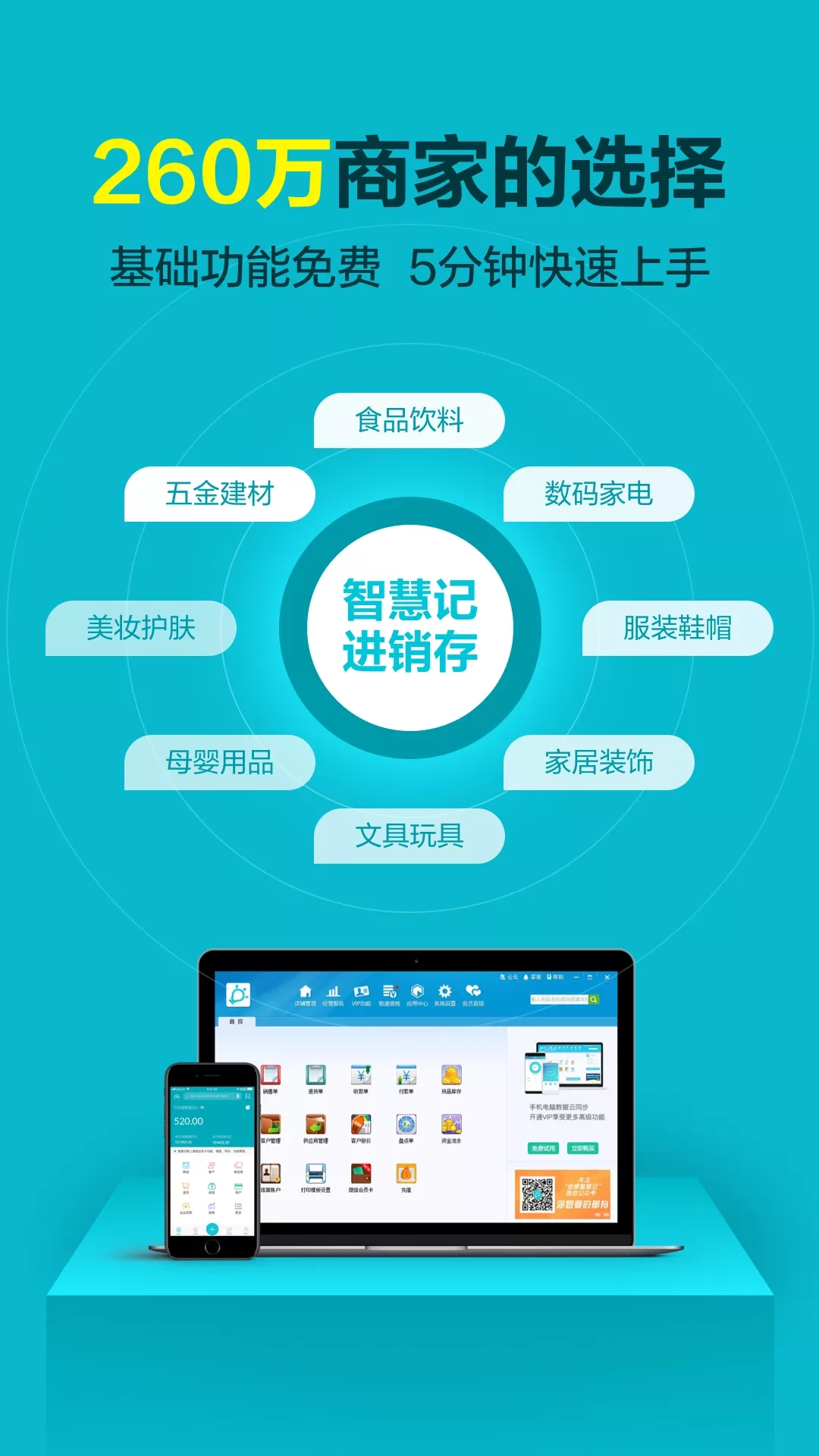 【金蝶旗下免费进销存】 智慧记进销存是专为小微个体户打造,拥有13年国内批发零售行业进销存软件经验。旗下产品包括智慧记星火云进销存、智慧记微店、智慧记收银系统、智慧记开店测算、智慧记商品查询、智慧记硬件设备等,已成为30+细分行业、117个国家与地区、260万批零商户的共同选择。 【核心功能】 销售开单、库存管理、订单管理、客户管理、供应商管理、对账管理、资金管理、报表统计等。 【功能亮点】 1.销售管理:支持一秒开单、一键入库、扫码收银和高效打印。 2.库存管理:包括商品管理、库存预警、供应商信息和库存盘点。 3.客户管理:记录客户信息、设置价格等级、自动对账和微信分享。 4.经营报表:提供销售统计、库存统计和更多分析报表。 5.更多功能:包括数据云同步、门店收银系统、微信会员卡和智慧记微店。 【适用对象】 适用对象包括批发、零售、批零兼营业务的个体户,覆盖五金建材、食品饮料、家居装饰、数码家电、商超便利等30+细分行业。 【数据安全】 1.ISO27001国际信息安全标准认证 2.国内电信级IDC机房数据存储 3.全球CSA云安全联盟成员认证