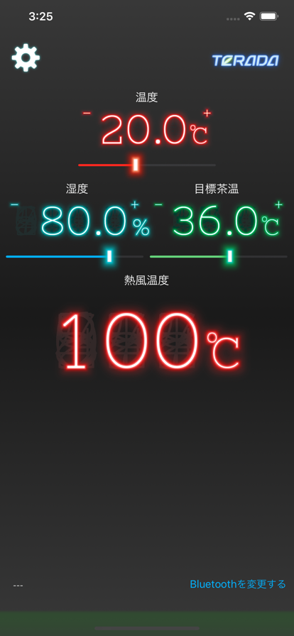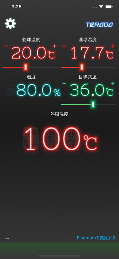 [!] Bluetoothの接続ができない場合 ・Bluetooth選択画面の右上 [再読込] ボタンで接続リセット、デバイスの再検索を行います。 ・接続するデバイス名をタップします このアプリは製茶機械に対して、温度、湿度、茶温を基に最適な熱風温度を計算するものです。 計算方法は寺田製作所の「製茶の参考」、静岡経済連の「茶生産指導指針」等を参考に作成されています。 基本的な使い方 ・温度、湿度、目標とする茶温を設定します。設定値が変わるごとに最適な熱風温度が計算、表示されます。 ・温度、湿度の入力は乾湿計での入力に切り替えることもできます。