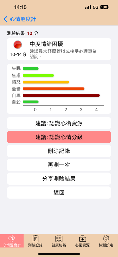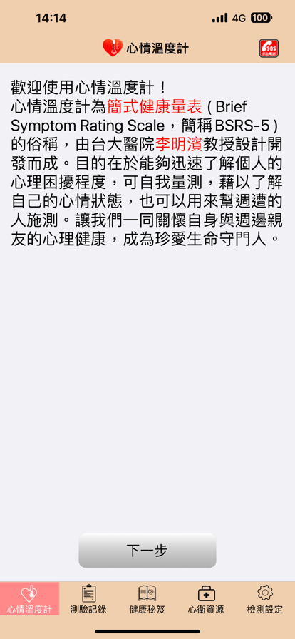 心情溫度計為簡式健康量表 (Brief Symptom Rating Scale,簡稱BSRS-5)的俗稱,目的在於能夠迅速了解個人的心理困擾度,進而提供所需之心理衛生服務。心情溫度計可自我量測,藉以了解自己的心情狀態,也可以用來關懷週遭的人。 心情溫度計具備的特點為: 1.簡短有效 2.容易使用 APP中提供各縣市心理衛生資源及自殺防治系列子書,供查詢與閱覽。讓我們一同關懷自身與週邊親友的心理健康,成為珍愛生命守門人。
