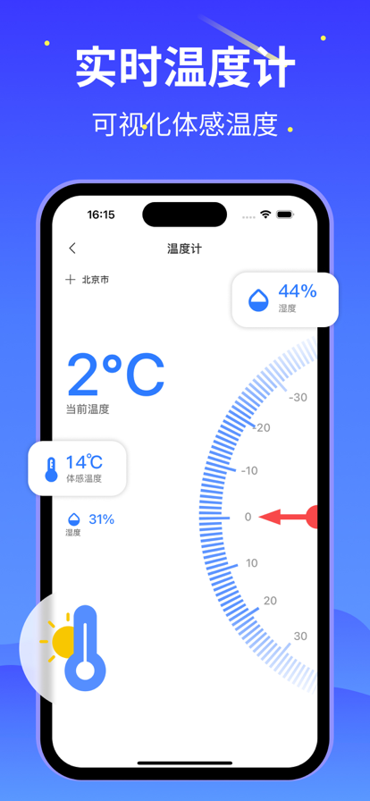 温度计APP - 一款智能温度计与天气助手 欢迎体验温度计APP,您生活中不可或缺的一款全能APP!借助先进的技术,我们为您提供了全面的温度信息,确保您时刻了解周围环境的变化,为您的每一日提供适宜的生活指南。 我们的主要功能包括: [ 实时温度显示 ] APP内以实时更新的方式展示当前温度,确保您随时了解周围环境的温度状况。 [ 温度单位切换 ] 根据个人喜好,随时切换温度显示单位,满足不同用户的使用习惯。 [ 历史温度记录 ] 回顾您过去的温度测量记录,了解温度的变化趋势,为个人健康和生活习惯提供参考。 [ 天气预报 ] 查看未来几天的天气预报,详细了解气温、湿度、风速等多项指标,助您更好地规划您的日常活动。 [ 15日天气预报 ] 提供未来15天的详细天气预报,帮助您合理安排未来的出行计划,应对气温的变化。 [ 两小时降雨提醒 ] 通过智能分析,提供两小时内降雨的可能性,并及时向您发送提醒,助您随时做好雨具准备。 下载温度计APP,让您的生活变得更加便利,随时随地掌握温度和天气情况,为您的每一日提供贴心的服务! EULA:https://www.apple.com/legal/internet-services/itunes/dev/stdeula/