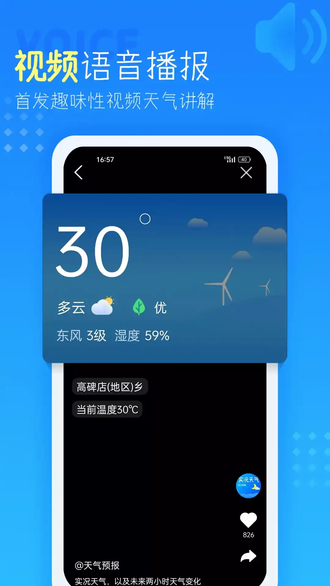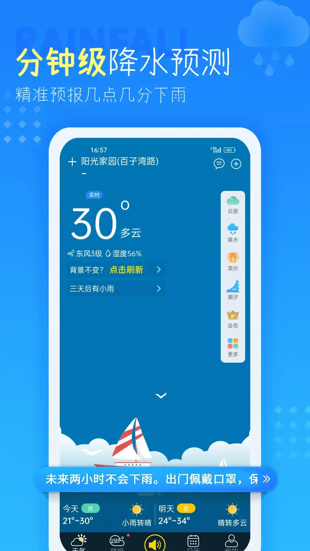 今日天气预报包含国内外2.5w+城市天气预报信息,能准确定位至小区街道及时推送天气信息,预测几点几分下雨下雪。采用国内外多家气象机构数据,天气预报信息准确快速,含有实况天气、24小时预报、未来15天天气预报、未来40日天气预报、空气质量、污染指数、温度趋势、pm2.5,空气质量指数等更加实用天气信息! 提供穿衣、洗车、紫外线、流感、运动、旅游等生活指数,还有精彩阅读等一系列趣味功能。准确天气信息,智能语音播报,解放双手,把天气预报送到你耳边,是您日常生活、出行旅游不可或缺天气预报APP! 【产品功能】 *分钟级降雨数据:提供分钟级降雨数据,能准确至几时几分下雨下雪,还能准确预测雨停雪停时间。并且拥有全国降雨云图数据,可在地图上直接了解降雨情况。 *潮汐天气:全新“潮汐天气”上线!支持全球485个港口未来15日潮汐预报数据查询,全球潮汐测定,数据图表展示潮汐涨落情况实用便捷。为您外出赶海、海钓、旅游等提供专业潮汐预报服务。 *丰富天气信息:实时天气数据、未来24小时天气预报、15日天气预报、40日天气预报、空气质量指数、空气污染指数、pm2.5、风力、温度、湿度、日出日落、气压、能见度。 *气象灾害预警:及时时间推送气象灾害预警,提前做好灾害防御、尽可能降低损失和不利影响。 *生活建议:紫外线、穿衣指数、洗车指数、运动指数、旅游指数等一手掌握。 *实用工具:地震专题、钓鱼专题、空气污染推送提醒等,关心天气更关心你,只为呵护你的生活与健康。 【产品特点】 特点一:消耗流量少!使用电量少!占用内存少! 特点二:能定位到街道小区推送天气信息 特点三:超炫天气动画,下雨、打雷、闪电动画唯美逼真! 特点四:天气信息丰富!准确!更新快! 特点五:未来24小时天气预报、一周天气、十天天气预报、40日天气预报、降水概率、空气质量、pm2.5、污染指数、风力指数等保障您的生活! 特点六:空气污染指数,pm2.5,空气污染指数排名!确保您实时了解空气质量状态,合理安排出行计划!