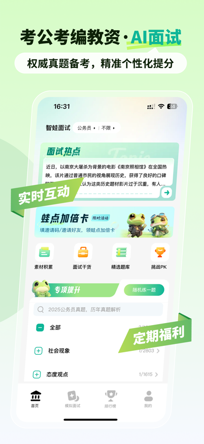 免费体验,已有10万+考生选择智蛙 【核心功能:AI 答题润色】 提交模拟面试,AI 将逐字逐句分析你的逻辑、用词和表达。直接展示优化后的“高分版本”,让你清晰看到差距,快速吸收亮点,让语言更有条理和文采。 【海量真题,实时更新】 紧跟考试动态,覆盖国考省考、事业编、教师、医疗等最新历年真题与每周时政热点。让你练的每一道题,都紧扣考情。 【覆盖所有主流考试】 一个 App 备考全部!完美适配公务员、事业单位、教资教招、选调生、三支一扶等各类结构化面试。 【多维度智能模拟】 不只练内容!开启摄像头,AI 还能对你的语速、音量、面部表情进行综合分析和打分,帮你打造自信稳定的临场状态。 服务条款:https://oss.washine.tech/Privacy-Policyy/washine-Terms-of-Service.html 隐私政策:https://oss.washine.tech/Privacy-Policyy/washine-Privacy-Policyy.html 使用条款:https://www.apple.com/legal/internet-services/itunes/dev/stdeula/