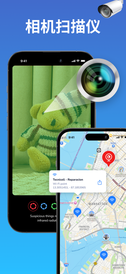 防偷窥(Anti-Spy) 是一款帮助您检测房间中隐藏摄像头的工具。 帮助你发现身边可疑的设备和摄像头,并获得关于所发现的每台设备的详细信息,帮您洞察周围的环境安全。 无线摄像头检测 连接无线WiFi网络,点击一键检测,即可智能识别房间内所有无线可疑设备。 摄像头红点检测 实时识别是否有隐藏摄像头。 当房间灯光变暗且手机非常稳定时效果最佳。 You may purchase an auto-renewing subscription to get Anti-Spy Pro Access. The payment will be charged to your iTunes Account when you confirm the purchase. The subscription automatically renews for the same price and duration period depend on the selected plan (weekly, monthly or annual) unless canceled at least 24-hours before the end of the current period. Subscription automatically renews unless canceled at least 24-hours before the end of the current period. You can disable the automatic renewal function at any time by adjusting your account settings. Subscriptions available (Price may change depending on your country): 1-week subscription for US$ 6.99, 1-month subscription for US$ 19.99, 1-year subscription for US$ 39.99 Anti-Spy is always with you, ready when you need it. Terms of use: https://picturesque-motorcycle-bd1.notion.site/Terms-of-Use-bde602426fef4f17a56b5579187f9b56 Privacy policy: https://picturesque-motorcycle-bd1.notion.site/Privacy-Policy-for-Anti-Spy-6287d560ec0c480b8fb65060f1408724