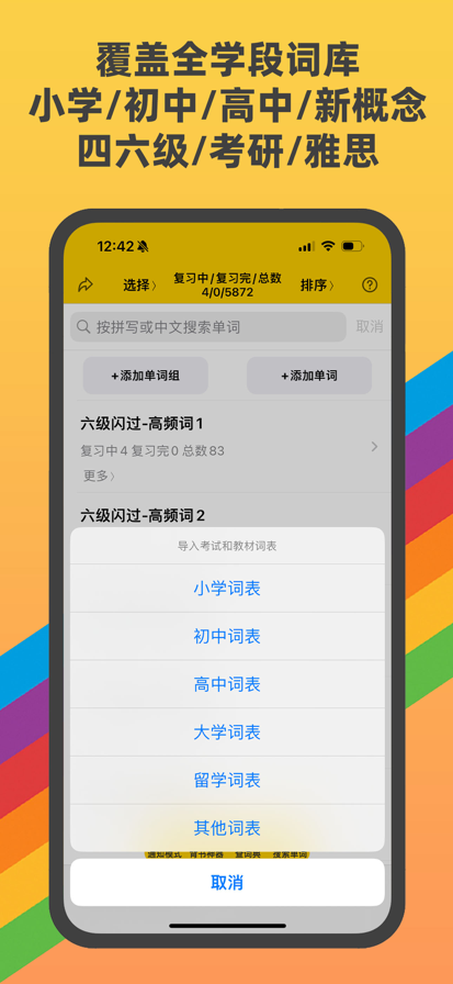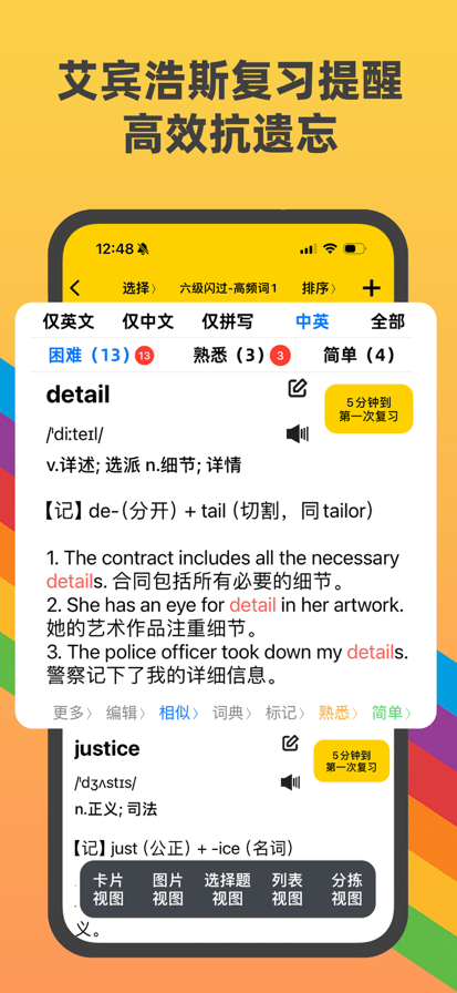 融合艾宾浩斯(Ebbinghaus)记忆曲线, 综合众多背单词使用者的实战经验, 通过与用户的简单交互, 利用人脑记忆黄金序列法找到学习者的记忆遗忘点,据此调整学习与复习进度,以达到长时记忆的效果。 所有内容均为离线模式,不需要连接互联网,软件支持iPhone、iPod touch、iPad等各版本的软硬件设备