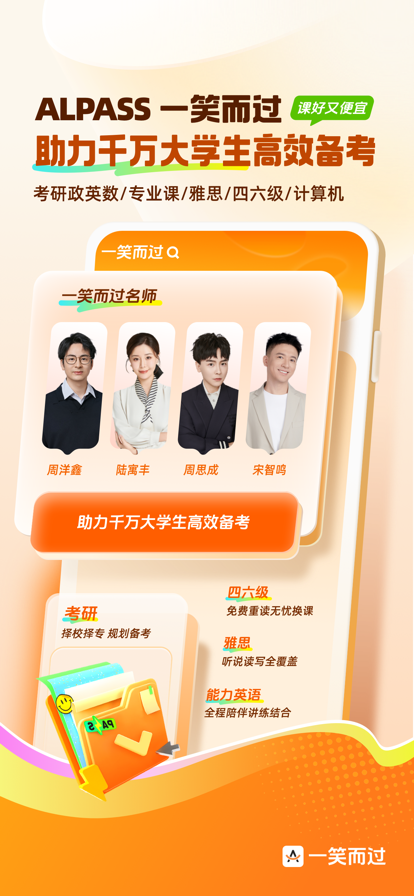 一笑而过APP应用是一款为中国百万大学生用户提供四六级、考研、英语学习、专四专八的备考辅导平台。平台拥有强大的师资力量和先进的教学服务团队,为用户提供教辅+服务的高品质学习解决方案,提供独家的学习图书资料大礼包,创始人周思成是原新东方名师,具有超高的人气,在广大学生中拥有良好的口碑和影响力。 独家礼包: 由一笑而过平台教研团队精心打造的独家学习备考资料,图书礼包; 精品课程: 四六级,考研,英语学习等丰富课程,覆盖大学生学习成长全过程; 直播课堂: 名师在线互动,实时答疑,高效解决课程学习中的问题,提高学习效果; 回放学习: 温故知新,自由回放,在回放复习中掌握真知。