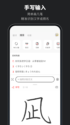 百万日语学习者、爱好者相亲相聚的家!假名、中日英、罗马音、活用、词组等自动识别,一键即搜;多达12种测试题型,自由配置,对生词狂轰乱炸;多家日语网站一键辅助搜索;自创单词,打造专属词库。<br><br>『交流をより自然に』 - MOJi辞書(じしょ)。目前已收录10万离线高频详解词条(离线词库定期更新)和百万云端词条,另附多家权威在线词典直达搜索服务。MOJi辞書将深刻围绕「体验」进行持续改进,これからも、よろしくお願いしますー<br><br>特色简介:<br>根据用户输入的内容(中日、假名、罗马拼音以及英文),自动快速检索词条并提供云端高精度预测结果;<br>采用单手操作设计,OneTap单击词条悬浮解释;<br>内置多家权威日语在线直达搜索服务:日+中日+英日全面应对;<br>高自由度收藏分类管理生词;<br>文法自动分析与管理;<br>全内容假名、罗马音注音服务;<br>文本翻译服务;<br>无需网络,内置离线详解词库;<br>定制每日单词推送,可选择不同词库(如 能力考N1词库),进行定点定量推送;<br>支持单词卡片导出,制作专属单词卡片;<br>高自由度测试练习,支持12种题型,支持艾宾浩斯遗忘曲线复习<br>每日全网络搜索热词一览,增加「不经意学习」机率;<br>自己创建单词例句,制作专属词库;<br>支持单词列表云端共享和下载;<br>一键查看动词活用一览;<br>收藏列表音频播放器;<br>长短句即刻翻译,一键发音!<br>日语新闻一键翻译,小白也能看日语生肉;<br><br>...持续进化,常用常新...<br><br>前方路漫漫,愿与大家携手并进,记得常联系:<br>通过App > 我的 > 联系我们<br>官网:https://mojidict.com?f=p12<br>邮箱:mojisho.support@mail.shareintelli.com<br>微信公众号:MOJi辞書<br>Twitter:MOJI_SERIES<br>微博:http://weibo.com/mojidic