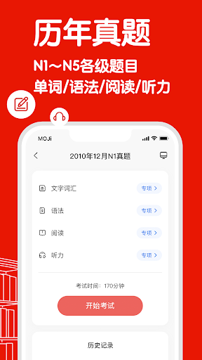 MOJiTest是专注于日语能力考(JLPT)的专业平台,致力于帮助百万日语爱好者零基础自学考级。我们提供N1-N5全套权威词库、考研专用蓝宝书、官方合作绿宝书、高考必修选修全套词库,更有历年配套真题及解析,让你沉浸模拟上场不慌张。背单词、做真题,就用MOJiTest!<br>【历年真题-配套全】<br>● 收录2010-2022年JLPT历年真题及解析,最新真题持续更新中!<br>● 支持单词/语法/阅读/听力专项训练,碎片时间高效刷题,巩固薄弱知识点。<br>● 沉浸式模拟真实考试系统,告别纸质刷题,帮你适应真实考场节奏。<br>● 支持长按选词查词,一键解析准确高效。<br> <br>【100+词书-背词快】<br>● 针对JLPT备考/日语高考/考研日语等常见考试,配备红宝书、官方绿宝书、新完全掌握、JLPT真题词汇、考研日语蓝宝书、高中日语必修等全套人工精校词库。<br>● 结合艾宾浩斯遗忘曲线,制定科学背词计划,让记忆更牢固!<br>● 全部词书进度共享,题型科学有效可自定义,助你提升背词效率!<br>● 难背的单词一键收藏,单独复习效率高!<br><br>【搜索识别-解题快】<br>● 强大搜索引擎支持,不仅能够查单词、搜语法,还能找真题。<br>● 拍照识别,不会的真题直接拍,一键找题给解析。<br> <br>【沉浸自习-效率高】<br>● 加入MOJi自习室,与上万小伙伴共同学习、相互激励。<br>● 支持自创学习小组,组内成员进度共享,互相鼓励送花花。<br><br>【更多特色功能】<br>● 错题本 - 难题好题一件收藏,点对点练习提高正确率,告别题海战术。<br>● 打卡日历 - 实时记录累计学词量、学习天数、学习时长,学习进度了如指掌。坚持打卡还能获得Moji独有勋章喔!<br>● 笔记收藏 - 时刻记录学习笔记,把不会的单词、语法全都收入囊中,反复学习。<br>● 桌面组件 - 根据个人喜好设置桌面组件形式与风格,碎片化时间背词神器,背词进度一目了然!<br>● 学习提醒 - 设置提醒,学习进度不落下。<br>● 发音调整 - 个性调整词书发音模式、语速快慢和发音次数,适配你的听力习惯。<br>更多有趣有用功能正在持续探索中,欢迎支持与关注~<br><br>关于我们<br>『交流をより自然に』 - MOJi以此为宗旨,结合百万日语学习用户需求,已打造MOJi辞書(じしょ)、MOJi阅读、MOJiTest、MOJiKana等日语全方位学习矩阵。MOJi将深刻围绕「体验」进行持续改进,これからも、よろしくお願いしますー<br> <br>联系我们<br>● 通过APP>设置>联系我们<br>● 邮箱:mojisho.support@mail.shareintelli.com<br> <br>了解更多<br>● 微信公众号:MOJi辞書(←客服找这里)<br>● 小红书:MOJi辞書<br>● 微博:MOJI_SERIES<br>● Twitter:MOJI_SERIES