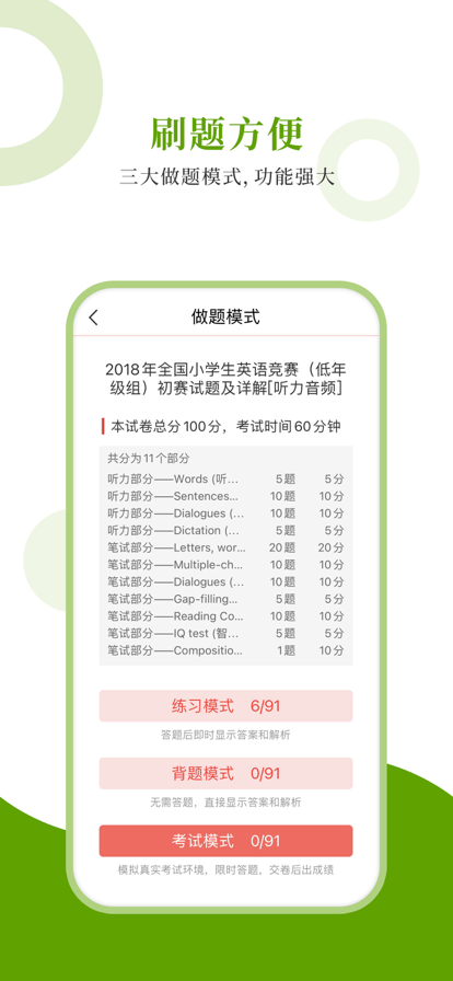 专为全国小学生英语能力测评考试精心准备的考试配套题库,每一道试题都有答案解析,为考试提供了充分的复习准备,可随时随地学习练习,支持手机、平板多端同时使用。 【内容】 低年级组 四年级组 五年级组 六年级组 【圣题库介绍】 1.产品内容特点 ①更新及时,根据最新大纲或教材修订补充; ②题量大,多个刷题板块,历年真题、章节习题、模拟试题; ③考点全,部分有视频讲解重难点,随题观看; ④解析完善,深入浅出。 2.软件功能特点 ①三大做题模式,适应不同需要; ②详细做题记录,把握复习进度; ③关键词搜索试题,哪里不懂搜哪里; ④错题自动收录,好题手动收藏,查漏补缺; ⑤分析错题记录,个性化智能出题。