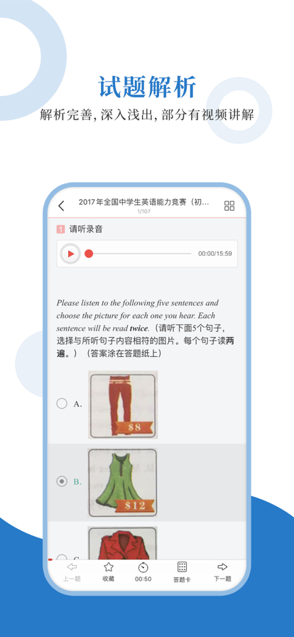 专为全国中学生英语能力测评考试精心准备的考试配套题库,每一道试题都有答案解析,为考试提供了充分的复习准备,可随时随地学习练习,支持手机、平板多端同时使用。 【内容】 初一组 初二组 初三组 高一组 高二组 高三组 【圣题库介绍】 1.产品内容特点 ①更新及时,根据最新大纲或教材修订补充; ②题量大,多个刷题板块,历年真题、章节习题、模拟试题; ③考点全,部分有视频讲解重难点,随题观看; ④解析完善,深入浅出。 2.软件功能特点 ①三大做题模式,适应不同需要; ②详细做题记录,把握复习进度; ③关键词搜索试题,哪里不懂搜哪里; ④错题自动收录,好题手动收藏,查漏补缺; ⑤分析错题记录,个性化智能出题。