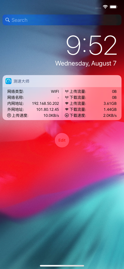 轻量级的流量监控小插件,快捷,炫酷、省心、省电、清晰、精准无延迟、杜绝偷跑,监控移动蜂窝&WiFi数据,妈妈再也不担心我的流量了! √ 快捷:锁屏状态下,下拉屏幕,通知中心直接查看实时流量数据。 √ 炫酷:在通知中心点击插件蜂窝流量区域,一键开启关闭移动蜂窝流量。 √ 省电:不后台运行。 √ 省心:每月套餐、上月结余、流量矫正、流量示警一个不能少。 √ 清晰:蜂窝网络(2G、3G、4G、5G、5.5G)/WiFi,联通、移动、电信的实时流量、每月使用汇总,图表清晰展示。 √ 精准:我的流量精确到当前时刻,无延迟,数据单位Byte,自动适配B、M、G单位。 ※ Widget插件添加方法: 屏幕下拉显示通知中心,在通知中心“今天”部分,选择“编辑”按钮,然后再列表中选择“流量小插件”,即可添加到通知中心。