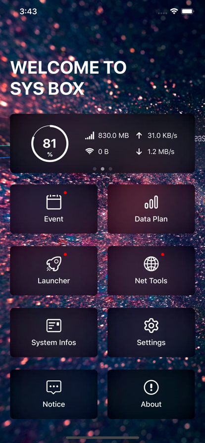 SYS BOX 是一款集合多个实用功能的通知栏小组件的应用,拥有极简的设计和优良的性能表现,功能强大而不累赘。 你可以在通知中心的“今天”页面里添加 SYS BOX 小组件,轻松获得以下功能: -- 网络流量系统信息小组件 -- 倒数日小组件 -- 快捷入口小组件 -- 网络流量监测小组件 SYS BOX 为专业用户提供了常用的网络工具,如Ping、DNS解析、路由跟踪等。 SYS BOX 提供可定制化的功能,你不仅可以更换应用的图标,还可以随心更换首页的背景并添加酷炫的星空效果。 SYS BOX 现已全面适配 iOS 13 深色模式。