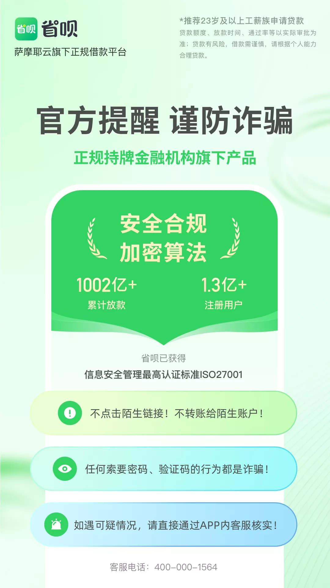 【品牌视觉焕新】 省呗logo更新,将原 “省” 字图标正式升级为 “省呗”,新版APP现已上线!焕新出发,让金融更温暖。 【产品介绍】 省呗成立于2015年,由深圳无域科技技术有限公司开发运营,利用人工智能和大数据风控技术,为用户提供方便、快捷、安全的金融信贷服务,超1.3亿用户选择。 【产品特点】 1、 7*24h线上申请,无需面签,随用随借; 2、放款速度快,审批通过后快至 3 分钟放款,手机借款更便捷; 3、息费透明:综合年化利率(单利)5%起; 4、操作便捷:借还灵活,凭手机号和身份证信息在线申请,可分12期; 5、安全借款:多项安全认证,保护用户个人信息,筑起隐私保护坚实防线。 【新人免息规则】 1、活动时间:即日起-2025年12月31日; 2、活动对象:在活动时间内首次完成注册的用户; 3、活动内容:新人专享最长30天免息优惠券; 注:免息优惠券的具体使用规则以省呗APP内展示规则为准。 【温馨提示】 1、贷款额度、放款时间、适用利率等均以实际审批结果及合同约定为准。 2、借贷有风险,借款需谨慎。请您根据自身实际需求及还款能力合理规划借款,理性消费,按时还款,避免逾期影响个人信用。 【联系我们】 官方微信公众号:省呗官方 客服中心:您可通过微信公众号 “小省在线” 咨询相关问题,客服将为您提供专业解答。 客服电话:400-000-1564