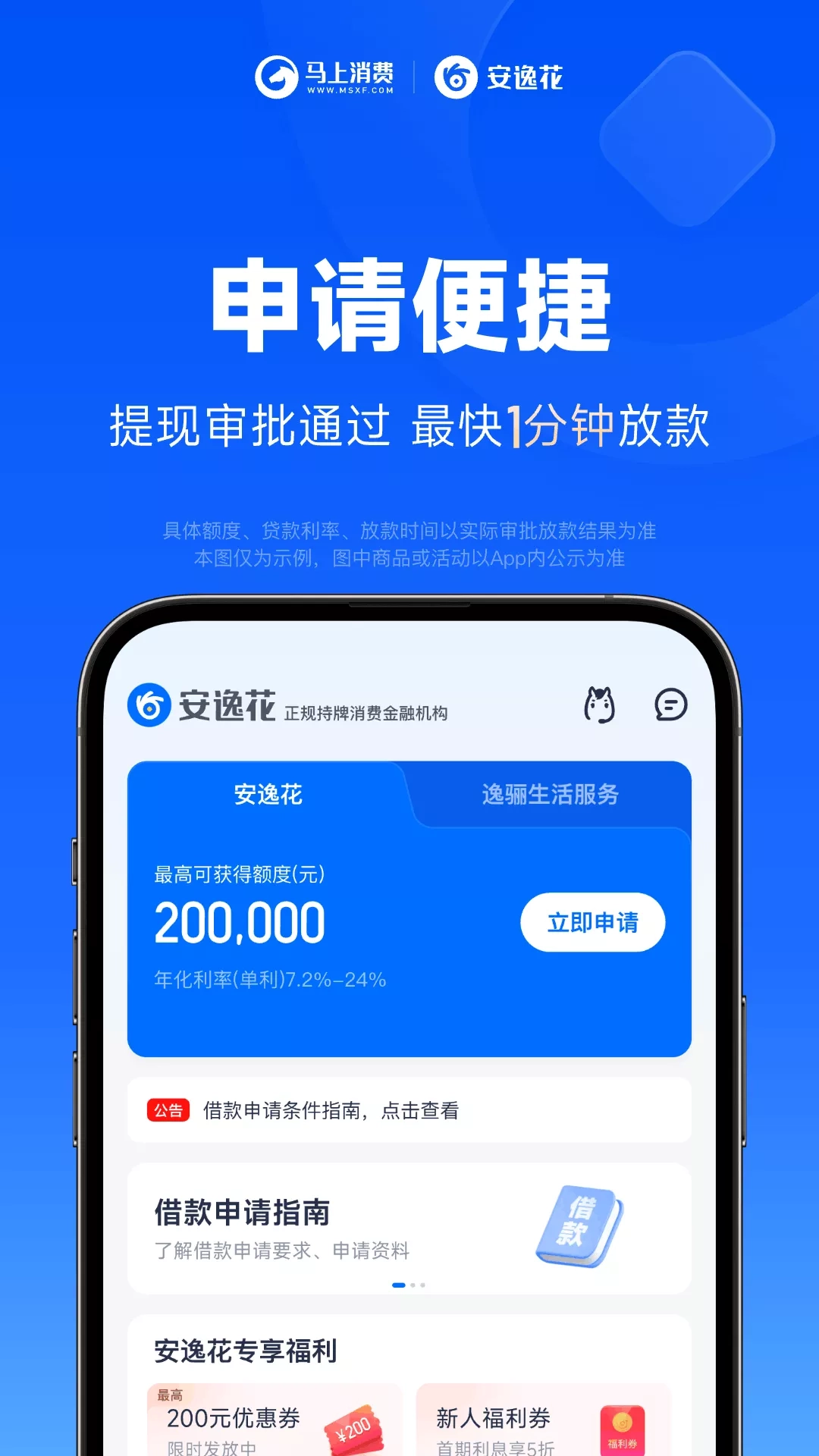 ◇贷款借款借钱分期,就找安逸花◇ 【额度高】信贷专业大平台,额度最高可达20万元 【更安全】持牌金融机构马上消费旗下产品,正规可信赖 【平台介绍】 安逸花-分期贷款信用借款快速借钱平台,为马上消费金融股份有限公司推出的,一款循环额度的贷款借钱产品,用户可以在额度范围内进行分期借款贷款,在享受安全、专业、智能、便捷贷款同时,可自主提现支付。 【产品特点】 1. 效率高:贷款全程线上,使用身份证+手机号即可申请 2. 操作易:借款进度随时查,还款操作方便快捷 3. 可循环:一次授信,循环使用,额度有效期为5年,年化利率(单利)7.2%-24% 4. 更专业:信用贷款,手机借钱(借款平台,贷款平台,小额借款,小额贷款,借钱平台)就找安逸花 【关于马上消费】 马上消费金融股份有限公司(简称“马上消费”)是一家经原中国银保监会批准,持有消费金融牌照的科技驱动型金融机构。 【资金来源】 资金来源于马上消费及/或其合作伙伴 【联系我们】 官网:www.msxf.com 客服电话:95090 【温馨提示】 贷款有风险,借款需谨慎,请依据个人能力合理贷款,理性消费,避免逾期