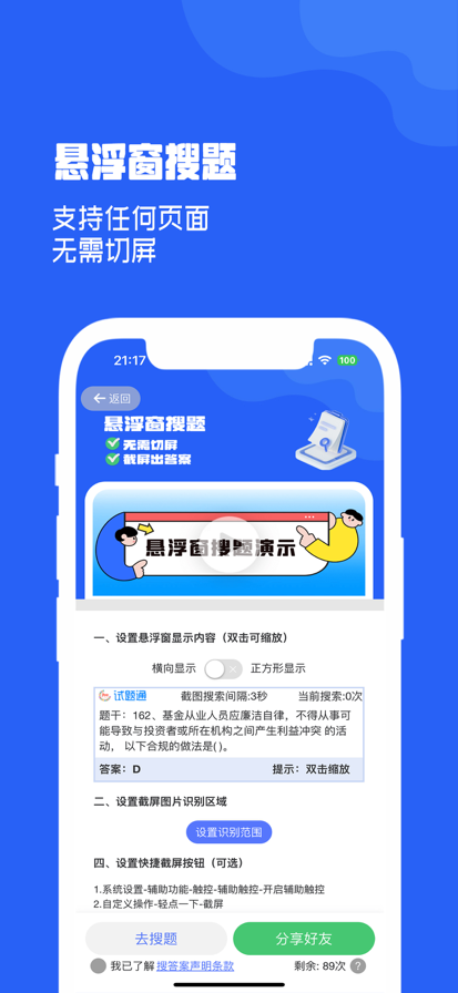 您的职业资格考试备考利器 【一键智能导入题库文档】 • 支持十余种题库文档格式,自动识别生成高质量试题,免除繁琐的手动整理与编辑过程; • 便捷地从本地文件、云端存储或聊天记录中一键导入题库文档,省时又高效; 【全面的搜题功能】 • 多样化的搜题方式,包括拍照搜题、扫一扫搜题、悬浮窗搜题、整页搜题、语音搜题及关键字搜题等; • 离线搜题功能,即使在没有网络的情况下也能轻松查找题目和答案; • 下载即享免费拍照搜题次数,让您随时随地解决疑惑; 【最新的专业题库】 • 提供涵盖多个行业的数十万套专业题库,确保内容的最新性与全面性; • 题库定期更新,紧跟行业动态,保证学习资料的时效性和准确性; 【专业级的刷题体验】 • 免费提供多样化的练习模式:全部练习、章节练习、错题本、收藏试题、题型练习、模拟考试等; • 创新的语音听题与阅读模式,让学习更加轻松愉快; • 组卷考试支持优先错题、优先收藏和优先未答等模式,满足个性化需求; 【超强错题本】 • 强大的错题管理功能,帮助您追踪学习进度; • 错题分类管理:易错题、待加强、已掌握、全部错题、今日错题、高频错题等; • 错题趋势图直观展现您的学习成效; • 支持跨平台同步,确保您的学习成果不丢失; • 误删恢复功能,避免重要数据的意外丢失;