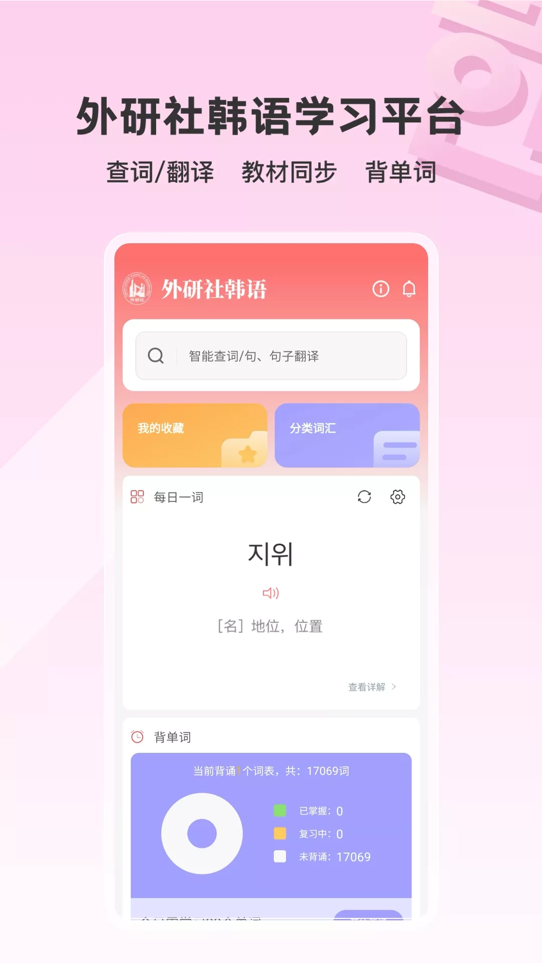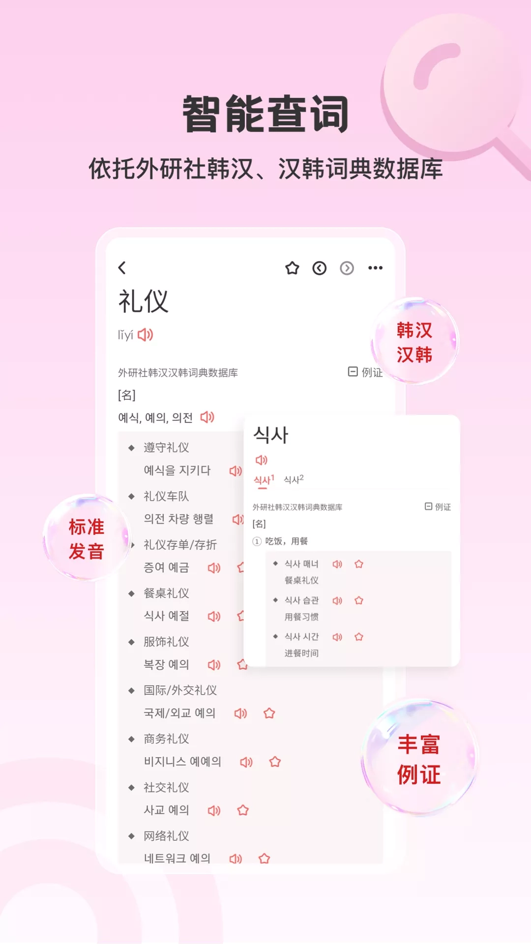 与其他韩语学习软件相比,本应用具有四大特色: ①外研社携手海笛出品(著名品牌有品质保障); ②独有的以外研社韩汉汉韩词典数据库为基础; ③与韩语教学、教材相结合(新标准韩国语·新版系列、新版首尔大学韩国语系列、新世纪韩国语系列等); ④内容和功能丰富全面(可学韩语40音、查单词、查例句,还能背单词、听教材音频等) ★★★ 内容特色 ★★★ 【40音零基础入门】 《我最爱的韩语40音卡片》配套教材音频及笔顺展示,手把手带你拼读韩语21个元音、19个辅音,零基础也能无障碍入门韩语! 更有《韩语40音挂图》将40音进行表格式排列,助你轻松识别每个音的发音特点及组合规则,系统地学习和记忆韩语基础知识。 【韩语教材配套资源】 全新开设学习栏目,新增:新标准韩国语·新版系列、新版首尔大学韩国语系列、新世纪韩国语系列等配套免费音视频资源。 【依托权威专业词库】 所收录词汇来自外研社韩汉汉韩词典数据库,由专业人士整理审校,聚合积累多年的韩语词典数据资源。 【收词全面领域广泛】 词库规模宏大,优选各级各类16万余词目;所收录词汇以语文学科为主、兼顾百科,涉及多个学科领域。 【释义简洁例证地道】 提供全面详细的词汇义项、例证,力求将每个词条都解析透彻,在答疑解惑的同时,助你有效提升词汇量。 【原汁原味地道发音】 单词、例句提供发音,助你感受原汁原味的韩语、学会地道口语。 ★★★ 功能特色 ★★★ 【智能查阅】 支持模糊查询,即使输入不完整单词,也可即时智能匹配。 多维度智能候选词,查词更快更便捷。 【反向查词】 忘记单词怎么办?不知如何用韩语表达?只需输入中文意思也可以查到单词。 韩汉、汉韩双向查词服务,融入智能联想技术,一站式查遍韩语词目、短语、例句。 【单词背诵】 --个性化定制背诵计划,AI根据艾宾浩斯记忆曲线智能提醒复习,轻松记住单词。 --考试词汇一应俱全,轻松突破:新标准韩国语系列/TOPIK Ⅰ/TOPIK Ⅱ。 【通知栏快捷查词】 学习时不方便打开词典查词?打开通知栏快捷查词功能,即可轻松查询生词。 【学习记录云端存储】 在本地和云端同步存储学习记录,再也不用担心学习进度丢失。 由外研社携手海笛官方正版出品,外研社韩语App集查单词和学韩语于一体,选择正版应用,学习更有保障!(版权所有,盗版必究)