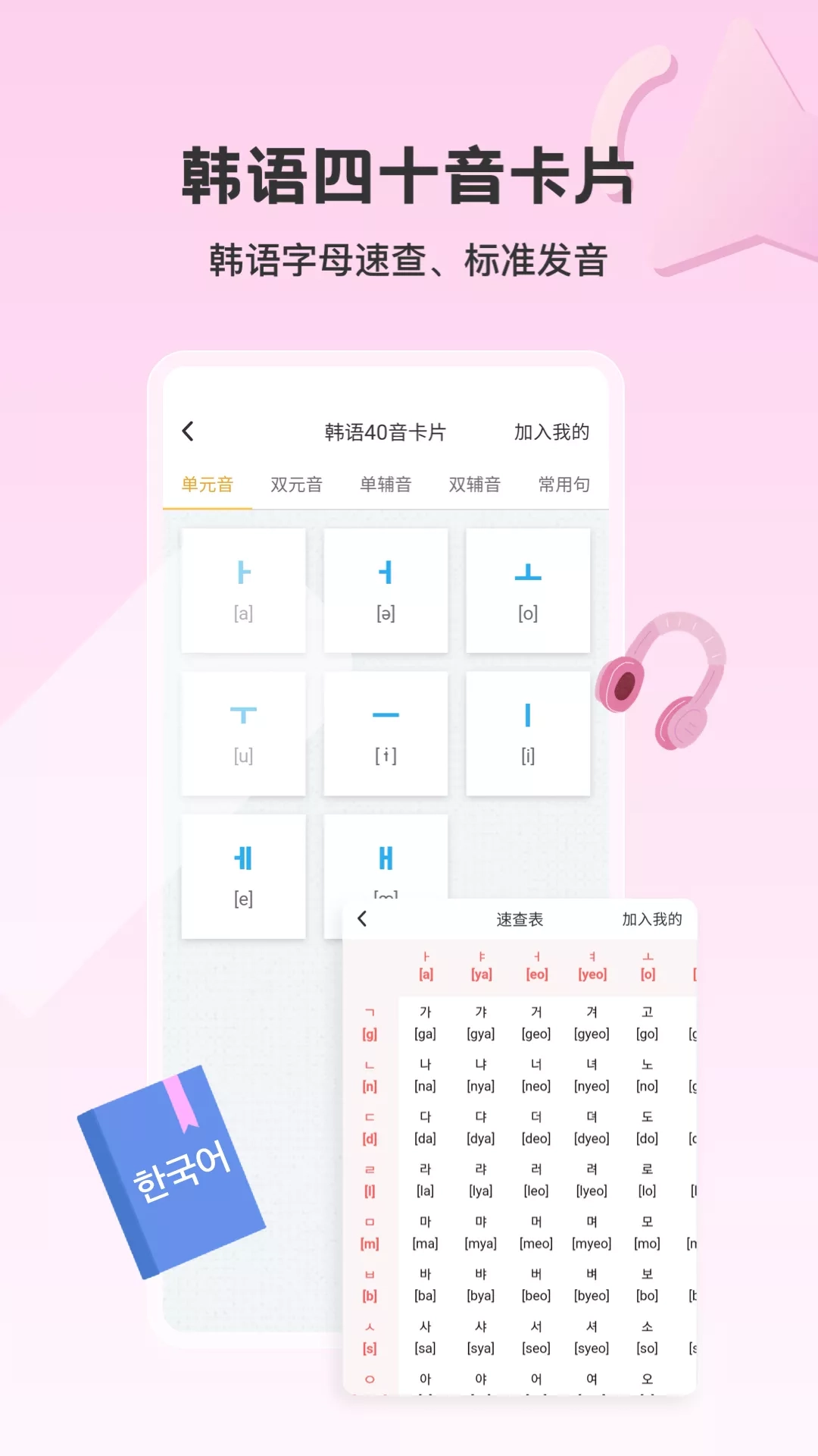 为韩语学习爱好者量身打造的学习软件。韩语发音、单词、语法、对话……步步进阶,轻松入门学韩语。 【功能介绍】 ●详尽的基础韩语发音 21个元音,19个辅音,地道首尔口音音频教学,详细的发音技巧,还能跟读录音哦。 ●有趣的场景课程闯关 精编吃吃喝喝、人际交往等各类专题课程,更有热门综艺《RunningMan》、《拜托了冰箱》……经典韩剧《来自星星的你》、《请回答1988》……从词、句到对话学习,循序渐进,闯关形式使学习更有动力。 ●标准的歌曲正音学习 IU、李孝利、iKON……各类韩语热门歌曲教学,从此说韩语,唱韩语一样了得。 ●专业的考试进阶课程 30天零基础至TOPIK1,专业课程,专享服务,随时随地跟着名师学韩语。 【使用交流】 ●您在使用中如遇到问题,可通过“常用问题与反馈”和我们联系,我们将竭诚为您服务。 ●有产品建议?想学习的歌曲?想了解的韩剧?欢迎留言,我们会努力改进!