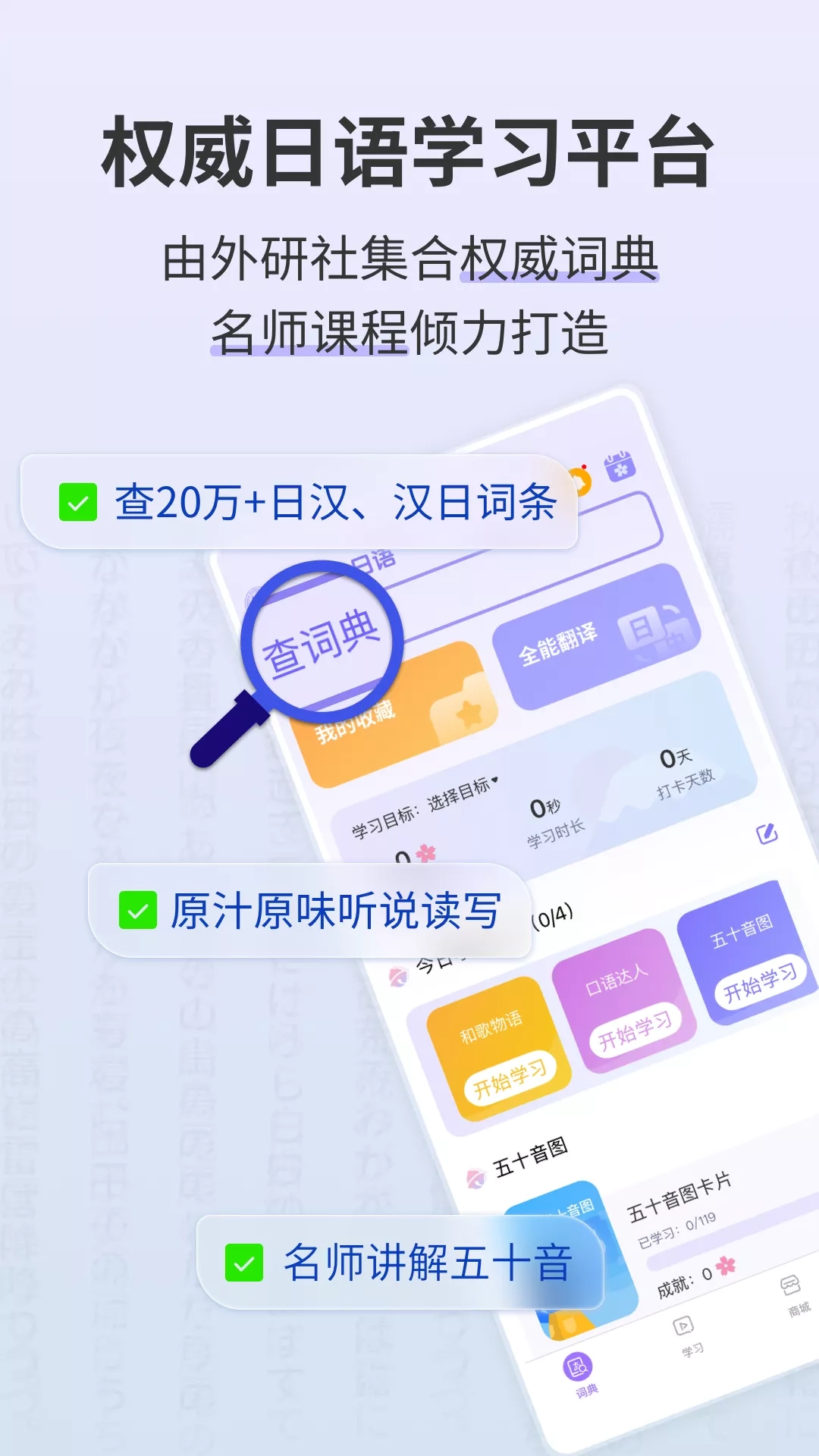 【玩游戏快乐日语,零基础免费入门】 专为日语爱好者量身打造的游戏化日语学习软件。是日语学习的好帮手,更是一位零基础小白学习五十音图的“好老师”! 【功能特色】 1、日语学习任务系统 零基础?不知道怎么开始学日语?学五十音?没有关系! 专为零基础学员打造的的日语学习任务系统,像玩游戏一样学习日语,玩着玩着就把日语学好了! 2、有趣的背词模式 学习、闯关、夺金币,趣味背单词,和死记硬背的时代说拜拜~ 3、AI游戏化,高强度BOSS战 高难度AI闯关BOSS,挑战你的日语综合能力。口语、翻译,弱一点都不行噢! 4、完备的学习功能 知识讲解、单词背诵、练习测试、总结复习、实战口语演练等等一系列完备的日语学习功能,带着你一步一个脚印的学好日语。 5、齐全的日语词库 主流日语教材词库:《新版中日交流日本语》初级-中级、《大家的日本语》1-2、《新编日语》1-4,日语能力测试N5-N1词库,各类重点、核心词汇一应俱全,考试突击背词不用愁! 6、专业的日语课程讲解 日语入门至精通,教学名师带你学习,带你飞! 特建日语学习课堂,聘请多位日语教学名师制作日语课程。课程嵌入软件学习体系,让你