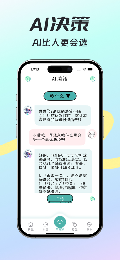 转盘鸭 - 你的专属决策助手,选择困难症大克星 “今天吃什么?” “周末去哪儿玩?” “谁去拿外卖?” “朋友聚会真心话大冒险?” “今天晚饭谁来买单?” “转盘鸭” 用大转盘来帮你轻松做决定,为你的生活带来一些小惊喜! 多种趣味决策方式,告别选择困难症,拥有超可爱可爱画风的生活解决方案。 AI决策: 根据您的实时位置,智能推荐餐厅、景点、外卖等,轻松做出选择。支持自定义权重和选项。 幸运小转盘:使用幸运转盘解决你的一切纠结。 摇骰子:模拟真实摇骰子的玩法,给你最真实的手感。 3D转盘: 像滑动地球仪一样,滑动出最终决策,充满趣味和仪式感。 指间轮盘(Tap Roulette):手指触摸就能体验多人轮盘游戏的紧张和刺激。 抛硬币: 带记分牌的抛硬币,支持五局三胜、七局四胜等多种玩法,轻松决出胜负。 抽盲盒: 聚会时轻轻一点,拆开盲盒,看看里面究竟是惊喜还是意外,增添乐趣。 敲木鱼: 用电子木鱼,积赛博功德,消气解腻两不误。 随机数: 一键生成随机数,抽签算命两不误。 滚珠落地: 滚珠随机滑落,每一个岔路都充满未知,最终落入某个决定,体验心跳加速的快感。 转酒瓶; 模拟真实转酒瓶玩法,还有更多皮肤可选。 未来,“转盘鸭”还将不断加入更多好玩的功能,敬请期待! 立即下载“转盘鸭”,让决策变得更简单、更有趣! 会员订阅: App内一些功能需要付费才能使用。如需取消订阅,请在下次订阅周期到达前24小时内退订。 会员订阅协议:https://www.apple.com/legal/internet-services/itunes/dev/stdeula/ 隐私协议:https://www.privacypolicies.com/live/b936c5ab-9377-4490-883c-54374d9b6774