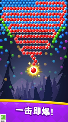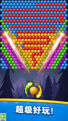 一款休闲益智类的射击消除游戏。在游戏中调整角度发射多彩泡泡,令人上瘾的泡泡射击游戏中,你将面临巧妙的关卡设计、华丽的特效和无限的乐趣,达到三个及以上的泡泡就可以消除啦! 1、三个或三个以上相同颜色的泡泡就能消除! 2、 一次性消除的泡泡数量越多,得分越高! 3、趁泡泡到达终点前消除所有的泡泡吧!努力获到三颗星!