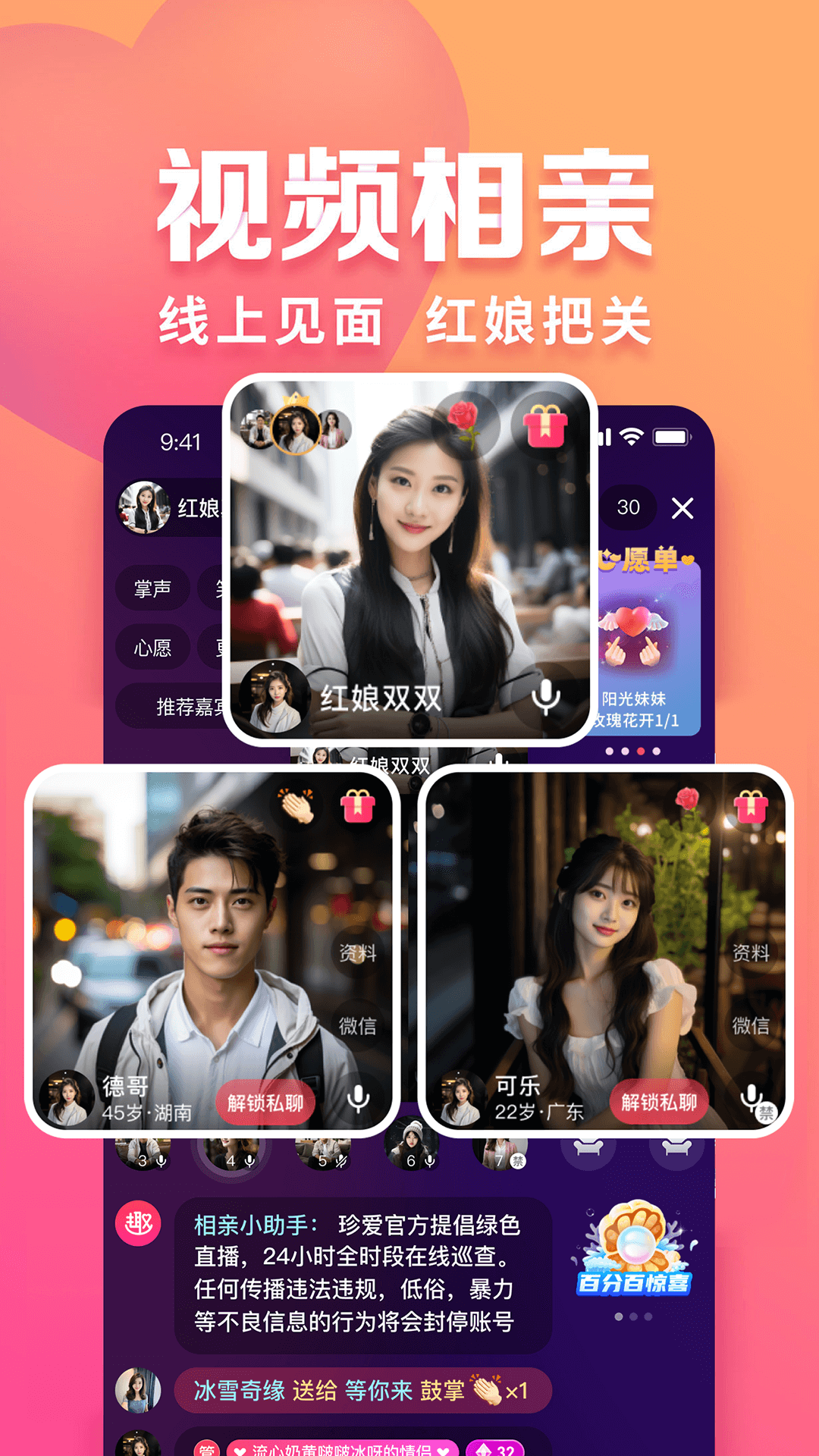 处处相亲是一款服务婚恋交友的相亲软件,能够快速匹配附近单身异性,在线视频语音畅聊实名聊天交友,不仅有专业红娘拉线,更拥有完善的用户实名及视频认证体系,提供用户安全的使用环境,附近爱聊天的单身朋友在这里同城聊天、附近交友、陌生约会、单身恋爱、灵魂交友。所有婚恋交友信息都经过严格审核,为您提供一个高品质的同城婚恋交友平台。处处相亲,可以和心仪的对象视频相亲及见面,帮您拓展社交圈,轻松搭讪、精准匹配,邂逅缘分。<br><br>【主要功能】<br>【同城相亲】同城附近陌生人语音视频聊天交友相亲,平台根据地理位置、兴趣爱好智能推荐附近同城的单身异性,一键点击,速配附近好友马上聊天。线上相亲交友,线下见面约会,同城附近陌生人都可以在这里快脱单。<br>【相亲直播】提供各种相亲类型直播间,更有专业红娘,打破壁垒破冰聊天,拓展交友圈子,更深入的了解彼此的生活,更快的熟悉彼此,满足你的需要。<br>【动态广场】了解心仪对象的动态,展示你的另一面,分享有趣的生活,让交友更加互动性以及趣味性;帮助你寻找共同的话题,打破交友尴尬,让关系更加的亲密。<br>【真实用户】经过系统平台以及人工严格的审核,可以做到用户真实可靠,保证对方资料真实性,可以放心和附近同城陌生人交友视频聊天<br><br>【处处相亲】更真实的交友婚恋平台,超多有趣的灵魂等你来撩!!!欢迎下载使用!!!
