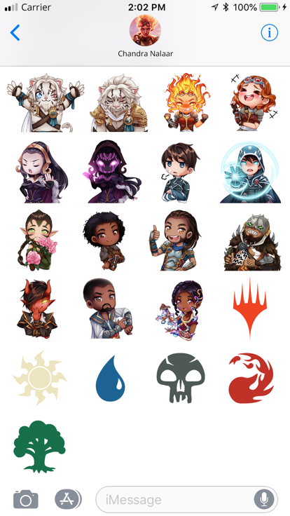 Magic: The Gathering Stickers – Planeswalker Pack Tap a sticker to send it inline within a conversation or touch and hold to place the sticker precisely where you want on the conversation (iOS 10 or later). Includes 21 Stickers: • Ajani: Disappointed • Ajani: Hug • Chandra: Fury • Chandra: Laugh • Garruk: Hungry • Gideon: Thumbs up • Jace: Sigh • Jace: Mindwipe • Kaya: Confident • Liliana: Sinister • Liliana: Talk to the hand • Nissa: Flowers • Saheeli: Gift • Teferi: Waiting • Tibalt: Giggle • Planeswalker Symbol • White Mana Symbol • Blue Mana Symbol • Black Mana Symbol • Red Mana Symbol • Green Mana Symbol Install Tips: To install your Magic: The Gathering Stickers Pack: 1. Launch the Messages app and then tap the App Tray icon next to the text field just above the keyboard. 2. Tap the App Store icon), then tap “Visit Store”. 3. Search for “Planeswalker Stickers Pack” and tap the price icon to begin installation. 4. Enter your Apple ID password or use Touch ID or Face ID if you have it enabled then return to your message. 5. The sticker pack will automatically appear in your App Tray. Usage Tips: Tap a sticker to send it inline within a conversation or touch and hold to place the sticker precisely where you want on the conversation (iOS 10 or later). Save time by adding the Planeswalker Stickers Pack to your favorites section and/or move it to the front of your favorites (iOS 10 or later): 1. Launch the Messages app and then tap the App Tray icon next to the text field just above the keyboard. 2. Swipe to the left and tap the More button at the end of the list. 3. Tap the Edit in the upper right corner of the app window. 4. Swipe down until you find your Planeswalker Stickers Pack and tap the green Add icon with the plus symbol to add it to your favorites. 5. Touch and hold the Planeswalker Stickers Pack app to move it to a different place on your Favorites list.