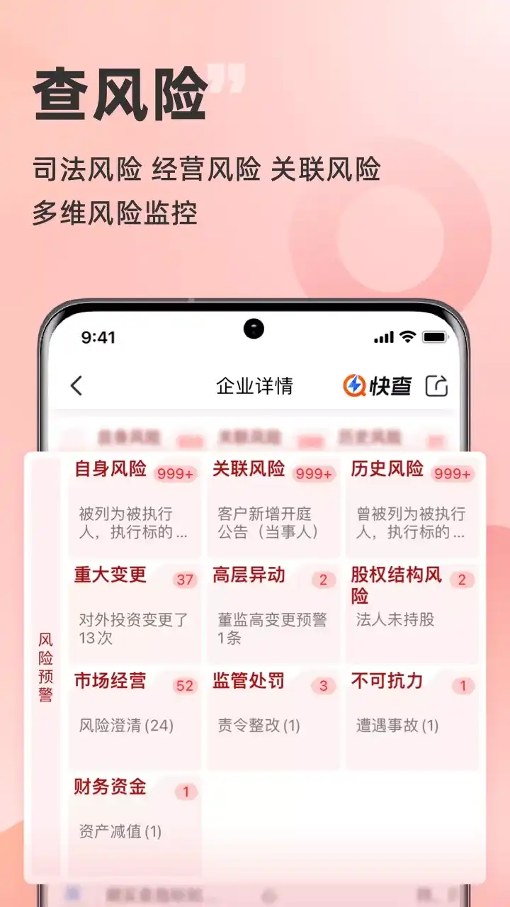 同花顺快查-免费查企业查数据查风险的大数据软件 快查是同花顺旗下APP,一款专业的查企业信息的免费软件。专注于企业信息背景征信查询以及企业风险内幕挖掘,为各界人士提供丰富、客观的企业背景、风险、经营、资质许可等信息数据,更是各界商务人士使用的企业征信利器。 覆盖1亿8千万+企业征信信息,查企业,查人物,查风险,查产业链,做调研,上快查任意查。 「下载快查,查看全量市场企业风险内幕」 【功能亮点】: 人人都可免费查询: 智能企业准确搜索:千万级企业总量覆盖,搜索维度涵盖法人、注册资本等基本信息,负面新闻、监管处罚等舆情信息,股权结构、对外投资等背景信息以及法院公告、经营异常等营信息。 企业风险内幕模块:426项数据免费查,公司合作、银行放贷、选股诊股之前来快查免费查询风险内幕。 数据超市全量数据:包括专项数据、榜单数据、科技型企业数据、园区数据,支持营销获客、媒体写文等各类场景应用。 快查助手客服模块:可反馈任何数据查询、软件使用问题,快查会第一时间为您解决。 【联系我们】 24小时热线:952555