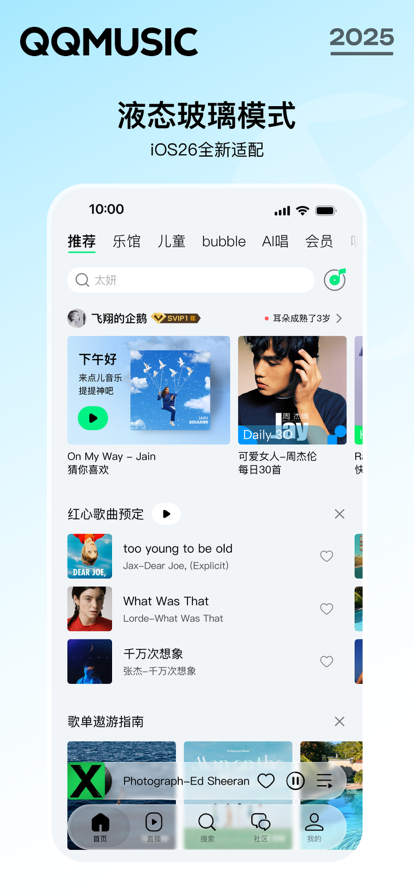 过亿正版音乐,热歌新歌每日首发,你想听的都在这里 • 海量的无损音乐曲库,优质而上乘的听觉享受 • 精品有声书、播客、儿童故事、助眠节目…沉浸式陪伴,度过闲暇时光 • 听歌识曲、哼唱识别,精准识别此刻播放或哼唱的歌曲 • 翻译歌词,支持数十万首热门英日韩泰歌曲的汉译音译 • 个性化推荐,全站依你的口味定制专属音乐内容 • 车载互联,支持宝马、福特等车型的车载应用 • 强大的搜索,歌手、专辑、歌单、MV、类型、歌词、拼音、语音多种搜索方式均支持 ------------------------------------------------------------------------------- 主要功能: 【海量音乐】过亿正版无损品质曲库,你想听的都在这里 【全新发现】精选推荐音乐杂志和专栏,寻回最初遇见音乐的喜悦 【视频】多品质MV播放/下载,精彩短视频,音乐不仅是听见 【个性电台】量身推荐符合你口味的歌曲 【评论】一纸乐评,解读音乐灵魂。一席热评,交换音乐故事 【扫一扫】扫二维码、扫图识专辑,除了音乐扫出更多精彩 【专业音效】SuperSound专业的特色音效,智能识别场景音效,适配百款耳机 【歌词海报】当歌词遇上图片,放肆分享你的心情吧 【那年今日】记录听歌回忆,重温那时的音乐心情 【跑步电台】歌曲匹配步频,好友PK助跑,让跑步不再孤单 【明星直播】观看偶像、音乐人新鲜的直播内容 【百变播放器】玩转播放页,一大波复古拟物播放页美翻你 【歌手写真】高清大图轮播离爱豆更近,开放投稿安利你的爱豆 【翻译歌词】数十万首热门英日韩泰歌曲支持中文翻译 【听歌识曲】精准识别、歌词同步显示、立即下载 【车载互联】支持宝马、福特等车型的车载应用 【免流量服务】2/3/4G下音乐任性畅听下载 -------------------------------------------------------------------- ---------- 【bubbleticket自动续费订阅说明】 1.订阅服务:bubbleticket连续包月(1个月) 2.权益:BubbleTicket是豪华绿钻的活动会员名称,享受豪华绿钻会员权益,包括播放VIP歌曲,使用SQ无损音质。 3.订阅价格:首月价格28元,自动续费为5元/19元/20元/21元/22元/23元/24元/25元/26元/27元/28元/40元/56元/月; 4.自动续费:购买连续包月会员的帐号,会在每个月到期前24小时,自动在iTunes账户扣费并延长1个月会员有效期。 5.关闭服务:如需取消订阅,请手动打开iOS的“设置” -->进入“iTunes Store 与 App Store”-->点击“Apple ID”,选择"查看Apple ID",进入"账户设置"页面,点击“订阅”,选择豪华绿钻自动续费取消订阅即可。如未在订阅期结束的至少24小时前关闭订阅,此订阅将会自动续订。 6.服务协议(含绿钻豪华版自动订阅服务规则):https://y.qq.com/jzt/service_terms/1e602e.html 7.隐私协议 :https://privacy.qq.com/document/priview/0b0dc16a0f004a35b77b7fd48a0b125b 【豪华绿钻自动续费订阅说明】 1.订阅服务:1个月豪华绿钻自动续费(1个月)、1季豪华绿钻自动续费(3个月)、1年豪华绿钻自动续费(12个月) 2.订阅价格:1个月豪华绿钻自动续费15元/月,1个月豪华绿钻自动续费21元/月,1个月豪华绿钻自动续费26元/月,1个月豪华绿钻自动续费28元/月,1个月豪华绿钻自动续费30元/月,1季豪华绿钻自动续费45元/季,1年豪华绿钻自动续费158元/年 3. 自动续费:购买连续包月会员的帐号,会在每个月到期前24小时,自动在iTunes账户扣费并延长1个月会员有效期。 4. 关闭服务:如需取消订阅,请手动打开iOS的“设置” -->进入“iTunes Store 与 App Store”-->点击“Apple ID”,选择"查看Apple ID",进入"账户设置"页面,点击“订阅”,选择豪华绿钻自动续费取消订阅即可。如未在订阅期结束的至少24小时前关闭订阅,此订阅将会自动续订。 5. 服务协议(含绿钻豪华版自动订阅服务规则):https://y.qq.com/jzt/service_terms/1e602e.html 6.隐私协议:https://privacy.qq.com/document/priview/0b0dc16a0f004a35b77b7fd48a0b125b 【超级会员自动订阅说明】 1. 服务名称:QQ音乐超级会员自动订阅 2. 订阅周期:超级会员连续包月、超级会员连续包季、超级会员连续包年 3. 价格:超级会员连续包月20元/月、超级会员连续包月30元/63元/80元/95元/108元/月、超级会员连续包季68元/季、超级会员连续包年248元/年、348元/年 4. 购买连续包月会员的帐号,会在每个月到期前24小时,自动在iTunes账户扣费并延长1个月会员有效期。 5. 如需取消订阅,请手动打开iOS的“设置” -->进入“iTunes Store 与 App Store”-->点击“Apple ID”,选择"查看Apple ID",进入"账户设置"页面,点击“订阅”,选择QQ音乐超级会员取消订阅 取消订阅即可。如未在订阅期结束的至少24小时前关闭订阅,此订阅将会自动续订。 6. 服务协议(含超级会员自动订阅服务规则):https://y.qq.com/jzt/service_terms/1e602e.html 7. 隐私协议:https://privacy.qq.com/document/priview/0b0dc16a0f004a35b77b7fd48a0b125b 【听书会员自动订阅说明】 1. 服务名称:听书会员自动订阅 2. 订阅周期:1个月 3. 价格:6元/月 4. 购买连续包月会员的帐号,会在每个月到期前24小时,自动在iTunes账户扣费并延长1个月会员有效期。 5. 如需取消订阅,请手动打开iOS的“设置” -->进入“iTunes Store 与 App Store”-->点击“Apple ID”,选择"查看Apple ID",进入"账户设置"页面,点击“订阅”,选择QQ音乐听书会员 取消订阅即可。如未在订阅期结束的至少24小时前关闭订阅,此订阅将会自动续订。 6. 服务协议(含听书会员自动订阅服务规则):https://y.qq.com/i/serv_terms_new.html#auto-renew 7. 隐私协议:https://y.qq.com/m/client/intro/privacy.html