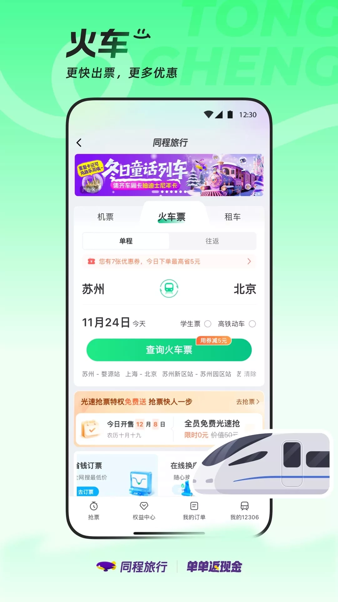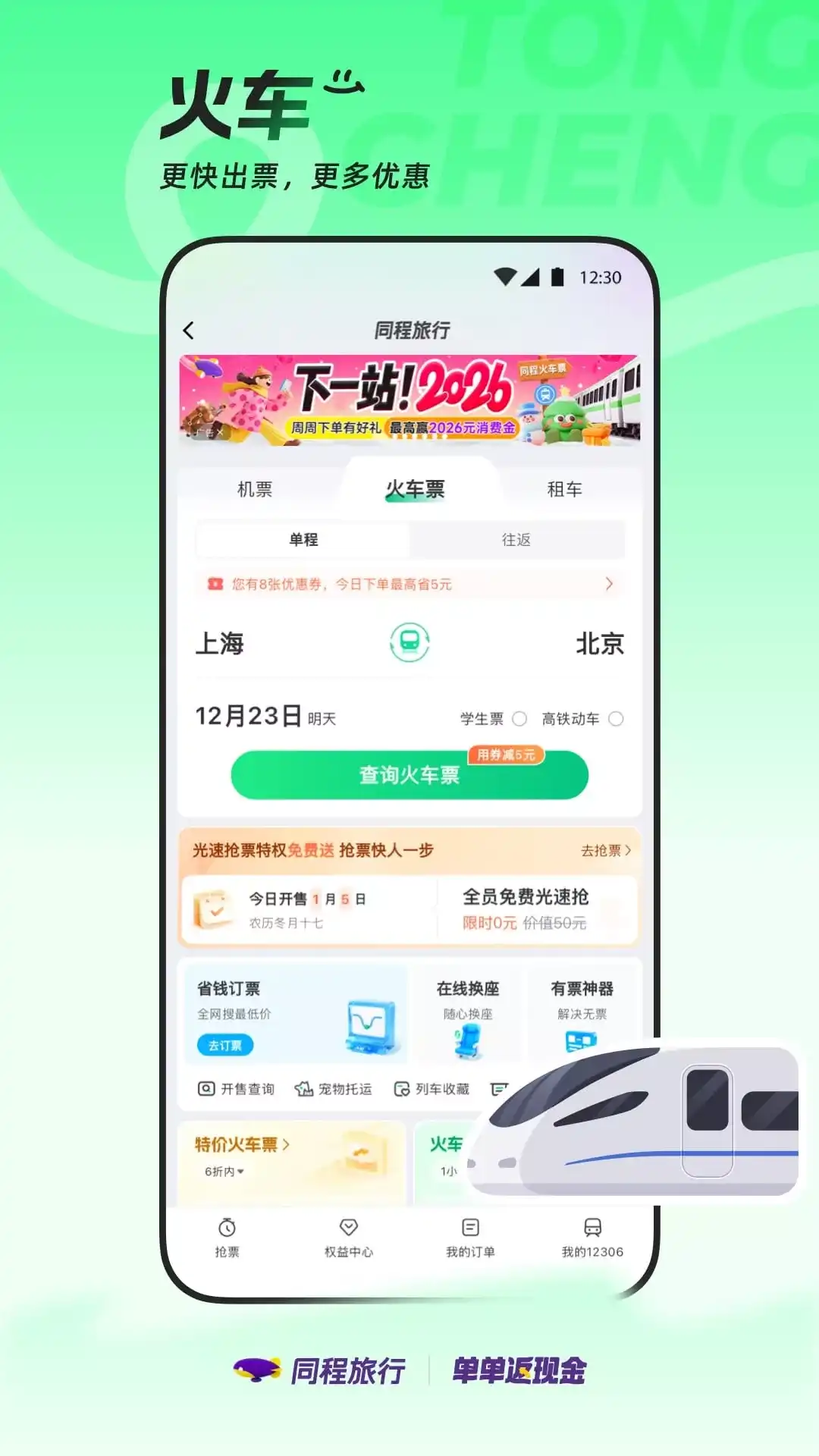 同程旅行,新一代旅行平台。 作为中国的优质在线旅行服务提供商之一,为2亿用户随时随地提供专业的机票、酒店、火车票、汽车票、门票、国内外度假线路等全方面旅游产品的在线预订服务,让用户享受更便捷、更舒适的旅行。 【产品功能】 1、新客礼包:同程旅行APP新用户可在同程APP内参与领取新客大礼包,内含国内机票、火车票、国内酒店、景点门票、汽车票、打车等新客专享红包,先领券再下单更划算,详情以活动内规则为准。 2、火车票:购票便捷,支持在线抢票、在线选座;票种多样,支持成人票、儿童票、学生票;智慧出行,智能推荐火车中转、多买几站、同车换乘等出行方式。 3、酒店:百万家酒店覆盖国内海外,钟点房/品牌连锁/民宿等多形态应有尽有,亲子/差旅/度假等多场景一应俱全。 4、机票:特价机票天天有,最低1折起;价格透明,大额优惠券天天领;免费选座,在线值机,随时掌控航班最新状态;线上退改更便捷,退改签不收取额外费用。 5、门票:全国海量景点优惠订,特价门票5折起;极速出票快乐游,免票入园不排队,无忧退订有保障;支持在线预约,无接触式购票安心游! 6、打车:一键呼叫全网打车平台,享受省心、便捷、快速、安全的