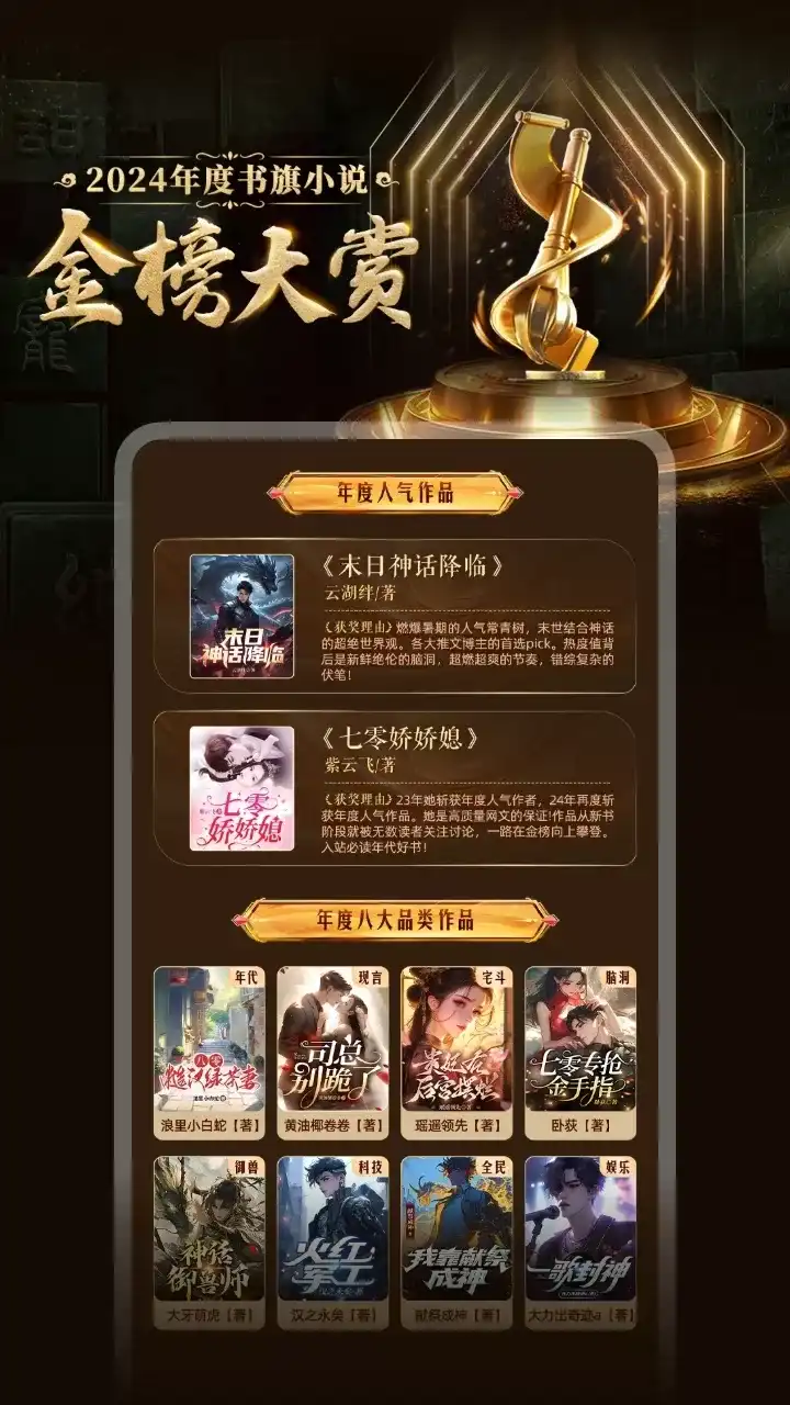 【2024年度金榜大赏即将揭幕】 千万读者见证、上亿张金选票的选择—— 2月中旬,年度金榜书单即将揭晓,为佳作荣誉加冕! 蝉联金榜一周年的NO.1,提前锁定榜首之位! 累计获得488.7万张金选票, 近千万读者追读, 数万人打出9.5分高分的佳作, 《第一御兽师》, 入站必看! 书籍介绍: 全球异变,魔兽入侵。 御兽师,肩负起拯救人类文明的重任。 肖星宇穿越后,觉醒【神级御兽系统】。 开启魔神之眼,可以看穿所有御兽隐藏进化路线、激活隐藏血脉、开启无限进化…… 多年后。,肖星宇身边上古神兽环绕,混沌天元龙、燃血凤凰王、冥府夜麒麟、弑神堕天使…… 身为龙国最强御兽师,肖星宇率领神兽大军踏碎山河,统治寰宇,将宇宙万族踩在脚下! 【海量热门影视原著】 《与凤行》 赵丽颖、林更新领衔主演,灵界在逃碧苍王沈璃与上神行止,在一起除恶扬善、探索真相的过程中互生情愫。 《白烁上神》 白鹿、敖瑞鹏主演《白月梵星》影视原著小说,聪慧狡黠少女白烁×淡漠慵懒妖王梵樾,畅销书作家星零仙侠巅峰之作。 《千朵桃花一世开》 张彬彬、孙珍妮主演,雪城少城主与暗域圣女三个身份下的爱恋痴缠。