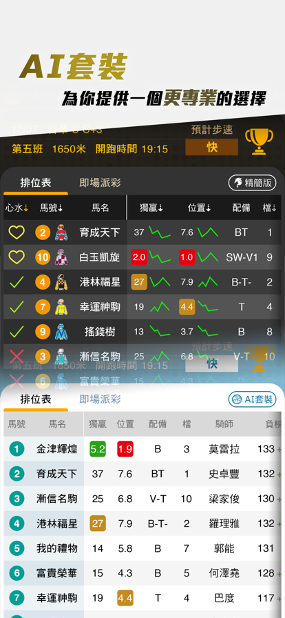 马场Boss为用户提供赛马资讯,让您紧贴马场内外最火辣消息。马场Boss以精准数据预测每场赛事马匹争胜机会,配合个人心得,助您运筹帷幄。用户可依个人喜好,选择马场Boss秘书,掌握马圈最新资讯。 「热爱岛」拆解赛事大数据 - 大预言套装:《大预言》大户谂紧乜?大户目标马又系乜?大预言话晒你知! 同时亦云集多位马评人提供《名家各场贴士》及《名家孖三T贴士》。 - $martMoney (海外转播/本地赛):现有的啡格/绿格赔率只能反映马匹闸前 WP, Q, QPL 赔率跌势。 《$martMoney》以独有的精妙计法,全天候监察各马匹,在不同时段,不同彩池的落飞情况,转化成数值,简单地帮马迷了解实际彩池的资金流向。 - AI 套装:智能分析,度马神器。 《排位/派彩》:赛日赔率走势折线图,马匹落飞、回飞一目了然。 《五程数据王》:赛绩影片、走位图,一应俱全。 《晨操资料库》:试闸片、晨操片、从化操练,应有尽有。 《智能备忘》:解构参赛马数据,展现各驹特点。 《即時賠率》:提供各場最新孖寶、連贏、位置連贏、二重彩、單T、三重彩、四連環及四重彩賠率。 - 密密过关宝:场场乱局唔知点算好,帮你度条心水过关飞就掂晒! 精准数据运筹帷幄 - 《马神精算机》:以精准数据预测每场赛事马匹争胜机会,用户亦可自行更改数值,加入个人心得,预测赛果。 - 《赔率比较》:用户可自行调校时间,比较马匹每段时间的赔率变化。 - 《刨马表》:预测马匹跑法,各驹优势。 - 《骑练分场表》:即场分析骑练搏杀动态。 骑练手风顺逐个捉 - 《骑练合作》有齐骑练合作、练骑合作成绩统计,更有针对大热及次热的合作数据,助你运筹帷幄。 - 《骑练摊路》有齐各骑练近6次赛事成绩记绿,边个旺弱一睇就知。 - 《骑师王/练马师王》骑师王/练马师王赔率及数据资料。 越洋转播赛 - 《排位/派彩》:海外赛事赔率及赛绩/派彩资讯。 。 私人秘书贴身服务 - 《马神秘书》全天候提供马场最火辣消息。 - 《秘书教室》有靓女秘书拍片教您赛马小知识。 马圈新闻每日放送 - 《马圈新闻》每日为你放送最新消息。 - 《马神影片》以轻松手法为您八尽马圈新闻。