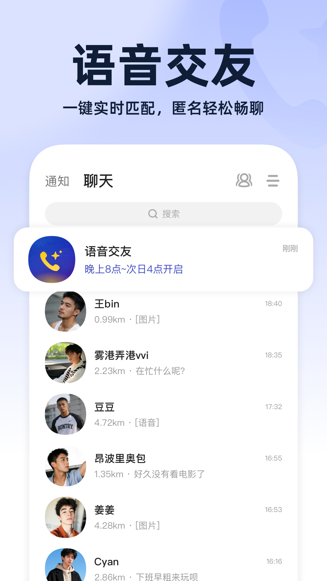 想聊天,想交友,想约会,想脱单吗? 同城单身男女在线汇集地,1分钟约见附近单身的TA! 也许你曾经对爱情迷茫失望过,但这都不重要了,因为你遇到了它! 它能让你摆脱深夜的孤独,让你不错过身边的每段缘分,让你寻觅到一份属于自己的真挚爱情! 同城陌约,是一款同城附近单身男女聊天约会社交软件,在这里,您可以倾诉心声、分享快乐,也可以发现TA的闪光点,默默拉近彼此的距离,相中命中注定的那个TA。 【推荐列表】:优先推荐附近异性,拉近彼此的距离感 【动态心情】: 告别尬聊,动态记录生活的点点滴滴 【甜蜜互动】: 精彩瞬间,私信分享彼此的所见所感 【多重认证】:实名认证,真人认证,视频认证,展现最真实的彼此 【同城交友】: 更多机会,尽在在同城陌约!
