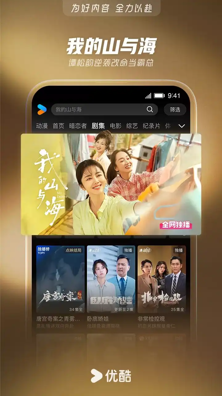 【精品内容,尽在优酷】 《我的山与海》我命由我!谭松韵逆袭改命当霸总 《寻秦记》古天乐林峯续写穿越传奇 《沧元图 前传》国漫双强纯爱CP超甜撒糖 《唐宫奇案》新春王炸!白鹿王星越破深宫诡案 《乡村爱情18》欢乐过大年!乡爱18谁看谁发 《情圣3》肖央化身“爱情侦探”反被套路 《周五晚高疯》内娱活人们携“秘密疯巢”周末出逃 《辽宁卫视春晚》过大年!优酷独家全程回顾 《师兄啊师兄》洪荒最强老六爽赢天道,稳到起飞 《秋雪漫过的冬天》赵又廷张子枫逆风翻盘 《暗恋者的救赎》罪与罚!绝望主妇深陷命案疑云 《非常检控观》炸裂开审!马德钟破解八大悬案 《风林火山》群星云集!暴力美学超爽港片 《剥茧》罗云熙变天才法医破诡案 《反人类暴行》品质好剧!《边水往事》导演新作 《逍遥》谭松韵侯明昊双世宿命奇缘 《山海经密码》以少年之志,破天命之局 《光阴之外》残酷末世少年屠神改命 《长安二十四计》成毅组团反杀到底 《天书黎明》探案小队寻宝藏破诡案 《百炼成神3》为爱逆天封神,挣脱宿命死劫 《凤凰台上》超级甜剧!任嘉伦彭小苒双强追爱 《神墓 年番》以我魔血染青天!少年踏破生死寻找身世之谜 《暗河传》热血江湖!龚俊执剑闯关破局 《新闻女王2》重磅回归!佘诗曼黄宗泽新闻职场风云再燃 《入青云》侯明昊×卢昱晓演绎宿敌变夫妻 《天相》废相少年度化灵煞逆转天命 《灼灼韶华》热依扎、杨祐宁携手逆袭闯商海 《师兄啊师兄》神仙年番看师兄!苟道成圣,稳到飞起 《凡人修仙传》爆款IP!杨洋热血修仙逆天改命 《哪吒之魔童闹海》哪吒涅槃重生高燃之战 《以法之名》年度狠剧!张译扫黑除恶掀司法黑幕 《云深不知梦》大女主复仇爽番来袭! 《藏海传》全员狠人!灭门案引连环杀局 国内外大剧热综、扎堆院线影片、二次元热血动漫……看视频,用优酷APP 【简介】 兼容Phone和Pad设备。优酷中国知名视频网站,优酷App为7亿用户提供电视剧,电影,动漫,音乐,新闻,娱乐,游戏,原创搞笑等海量影视,高清流畅播放,极速离线缓存,支持微博、微信、朋友圈一键分享。强大搜索功能,优酷在手,应有尽有! 【温馨提示】 期许与鞭策,只为更好的起航!当您使用中如有任何疑问或想吐吐槽,都热忱欢迎您致电我们:400-810-0580(或通过“APP-设置-问题反馈”专属通道留言),优酷君一如既往在等你! 同时,优酷君也期待您脑洞大开的创意与想法,为我们建言献策,凡经采纳即赠优酷定制精美礼品一份哦!