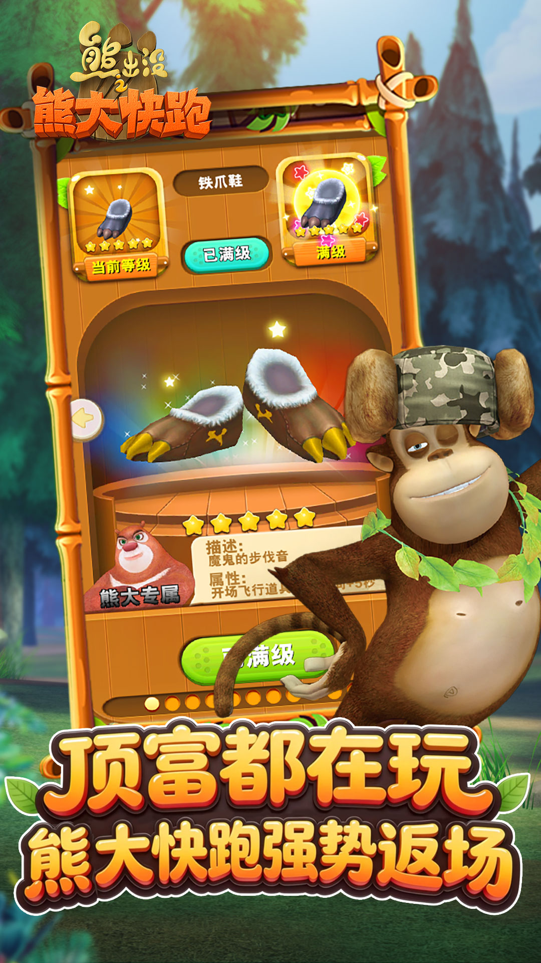 【正版授权 经典形象】 官方授权正版手游!经典形象萌动归来,带你游曳险象环生的丛林作战!游戏根据经典动漫大作改编,高保真还原动漫经典人物,加上富有想象力的关卡场景,让你在熊大的冒险世界中无法自拔! 【多样玩法 引爆潮流】 萌宠孵化养成,乐趣无穷,强大的宠物属性加成,让你轻松跑出高分。紧张刺激的关卡跑道、还原经典的人物形象、挑战极限的PK对战、宠物养成、每日挑战,更有独特的抽奖玩法,尽在《熊出没之熊大快跑》中等你来玩! 【精致画质 全面升级】 老朋友,新感觉!《熊出没之熊大快跑》画质全方位升级!!唯美明亮的画面加上精致细腻的光影效果,还有震撼视觉的动画效果,给人IMAX般的观影体验,让你的每一次跑酷都有不一样的体验!